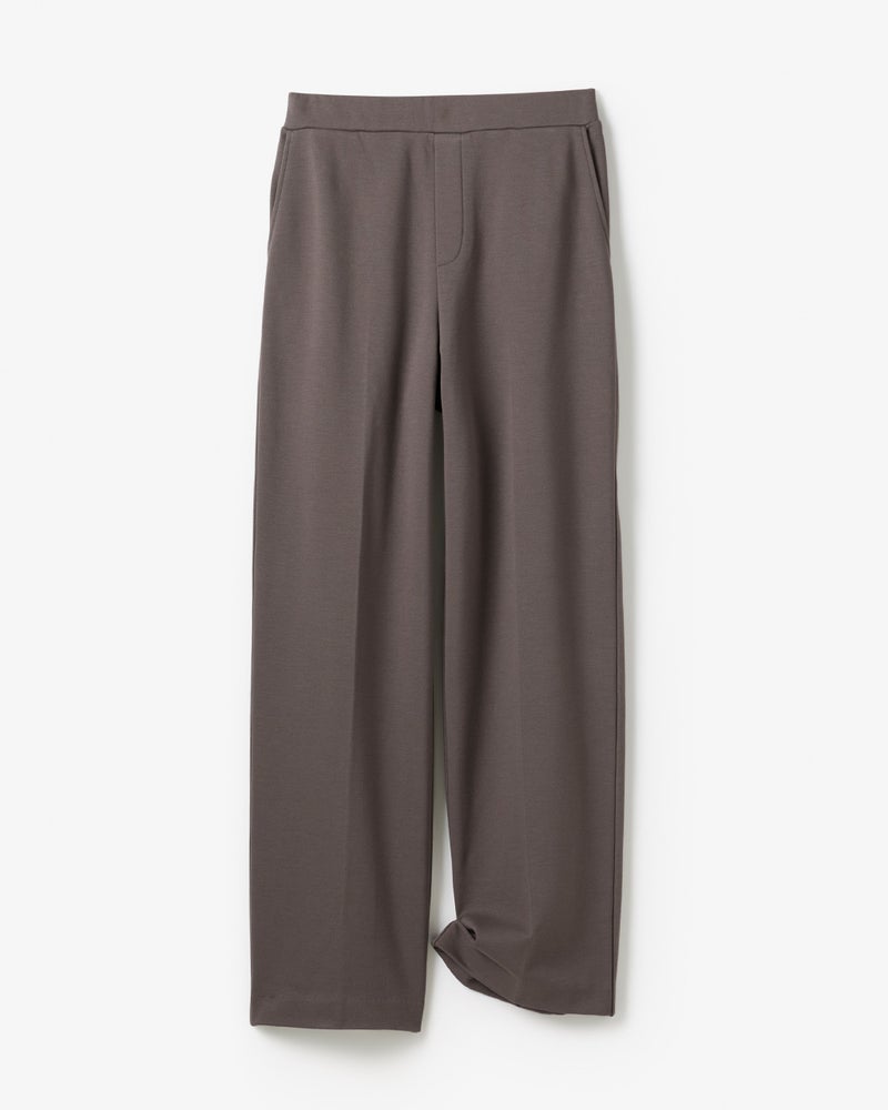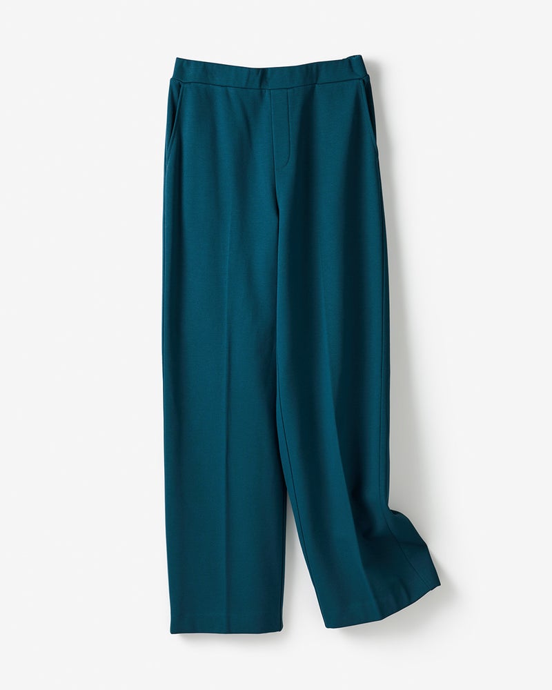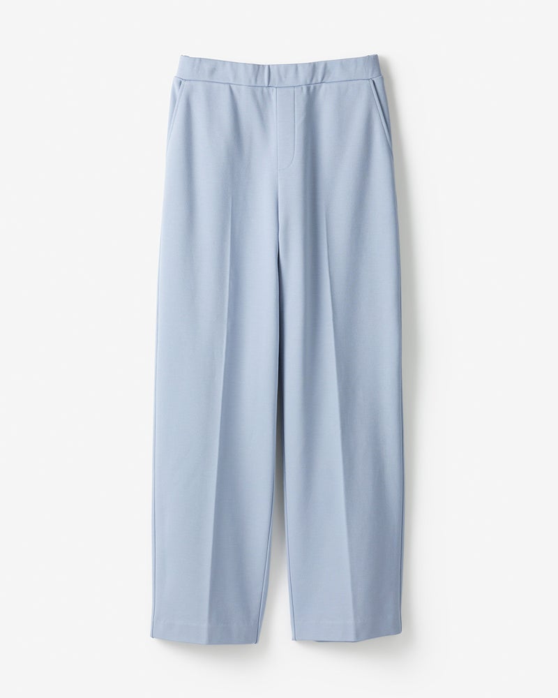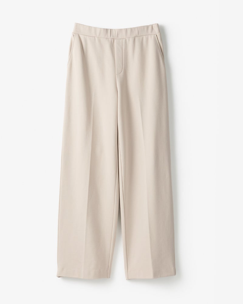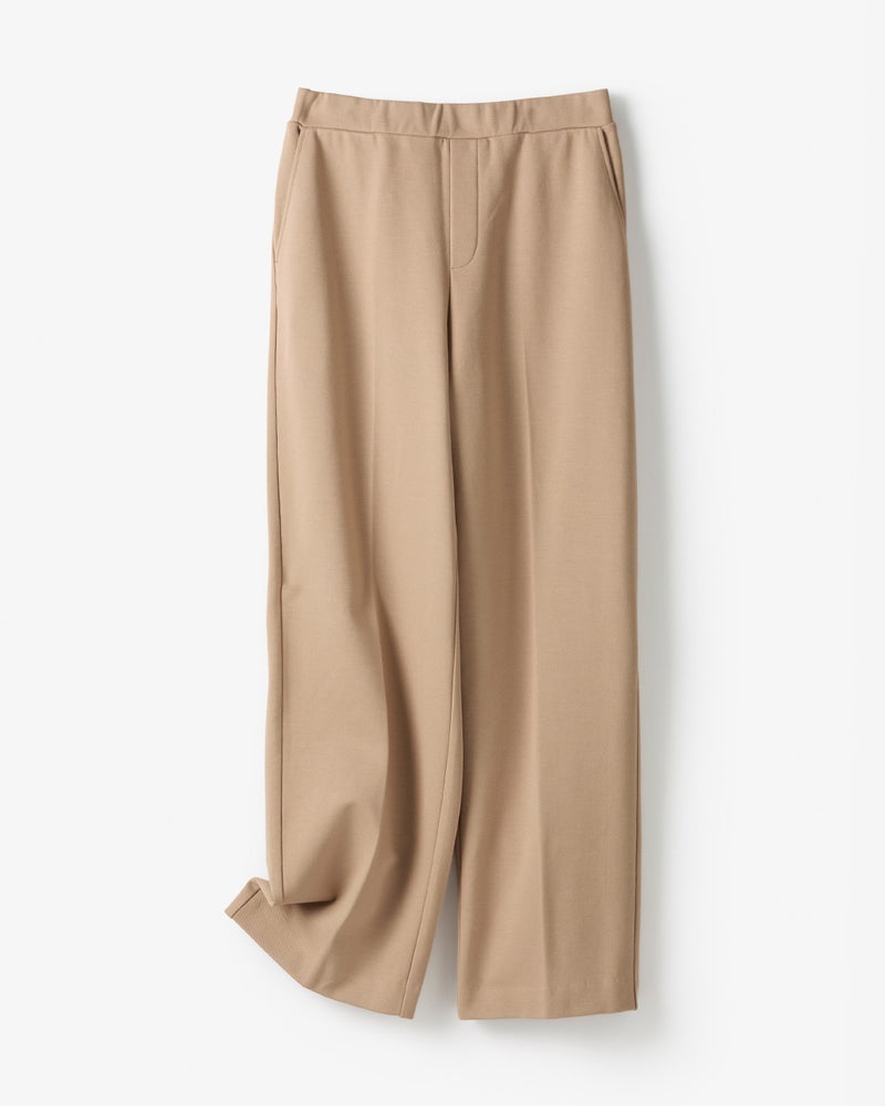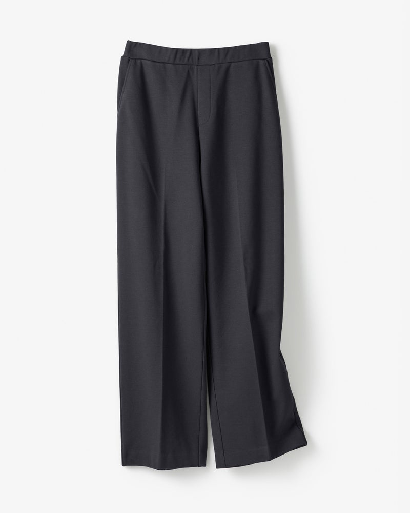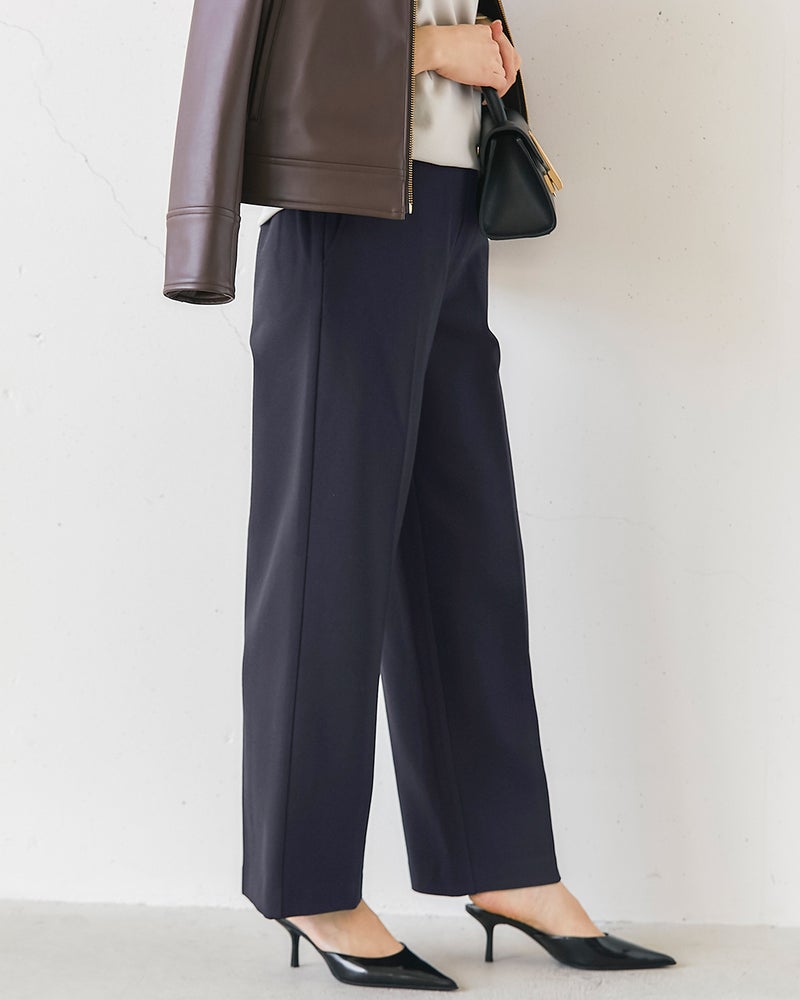 今シーズンは4つのシルエットをご用意。ほど良い筒幅で着回しやすいこちらのストレートには、センターラインできちんと感もプラス。ウエストは総ゴム仕様のラクチン設計ですが、ファスナー風のステッチ入りで綺麗にはけるデザインです。