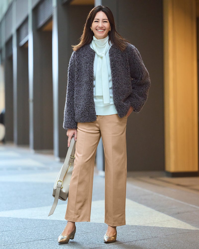 表地は裏起毛パンツらしからぬ上品な綾織り素材だから、お仕事シーンのようなきちんとスタイルにも対応可能。適度な厚みとハリがあってボディラインを拾わないのに、ぐんぐん伸びて楽々動けるストレッチ性も魅力です。