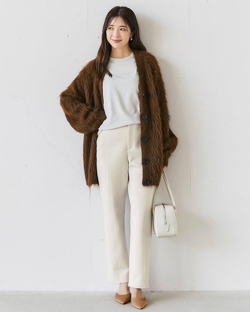 パンツ前面をに切り替えを入れ、立体的に仕立てたテーパードパンツ。下半身のラインを拾わない構築的な素材感で、どんな体型でもストレスフリーにきれい見えを叶えてくれます。