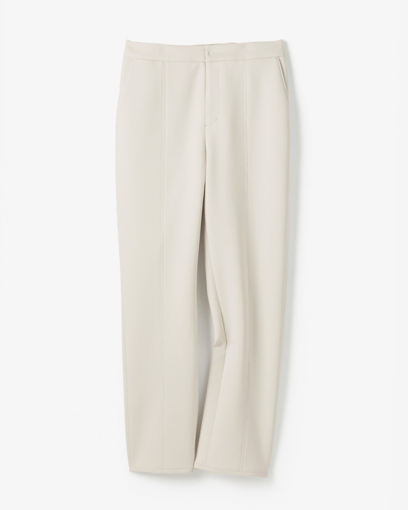ドレスパンツ級の上質感ウエストゴム✕ジャージー素材とは思えない美しいシルエットの秘密は、全面に施したセンターシームの立体感。ボディラインを拾わない素材感で、快適に美脚を叶えます。