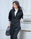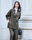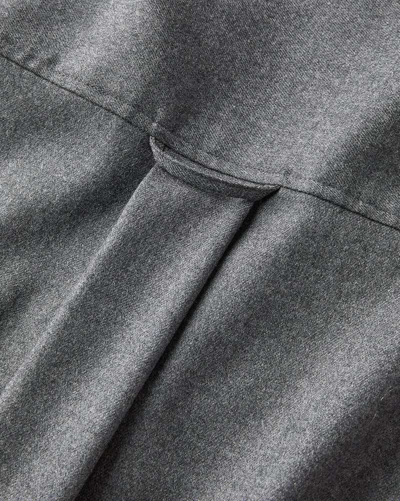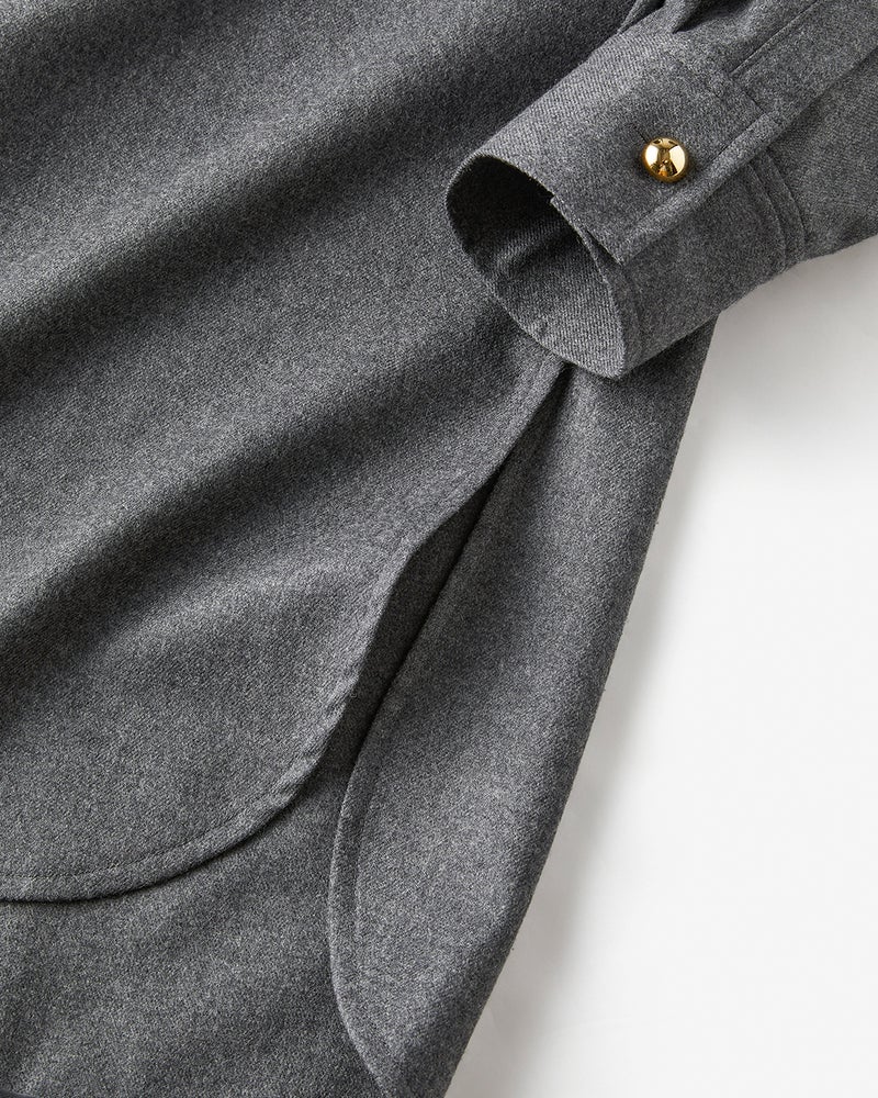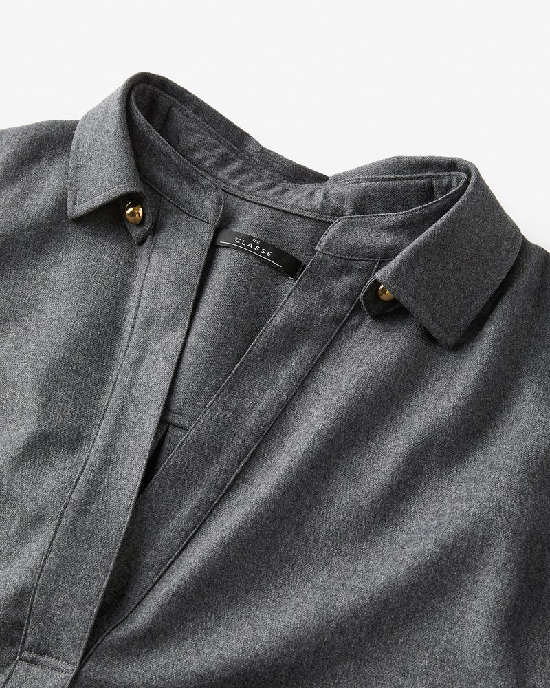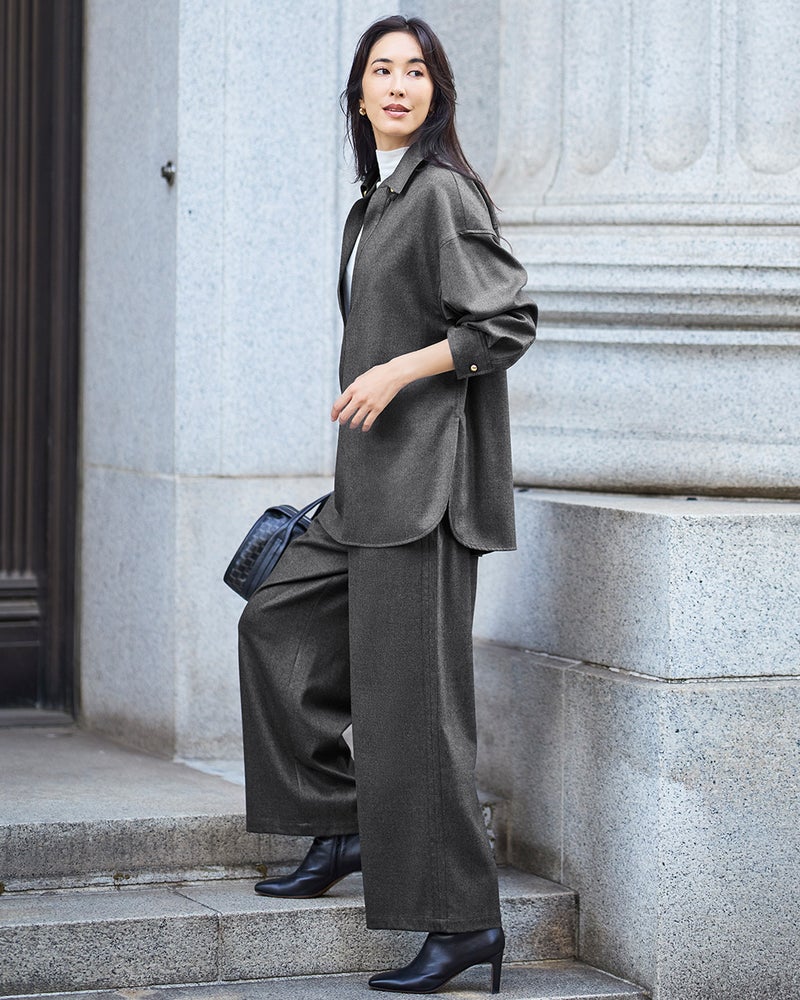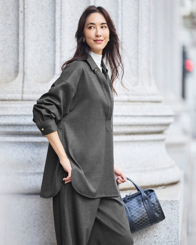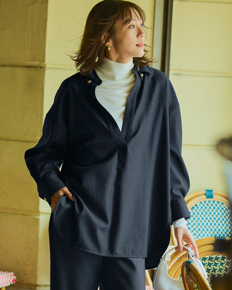 リュクスな素材を、あえてラフに着こなす。そんな大人の女性にこそ似合う着こなしを叶えるのが、なめらかな高密度フラノウールで仕立てたスキッパーブラウス。衿を抜いたリラクシーな雰囲気のオーバーサイズフォルム、同素材のパンツと合わせれば上質な休日スタイルに。アクセントの金ボタンはラフな着こなしに品を引き寄せてくれる。同素材のパンツ(商品番号 32196)とのセットアップもおすすめ。
