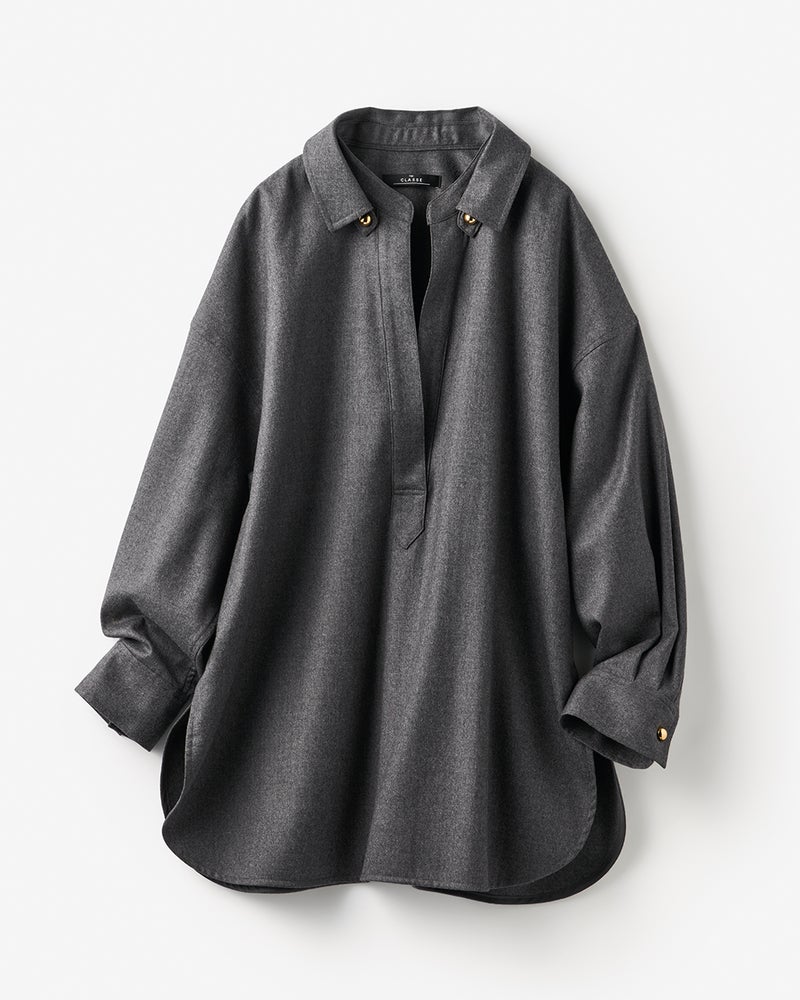 リュクスな素材を、あえてラフに着こなす。そんな大人の女性にこそ似合う着こなしを叶えるのが、なめらかな高密度フラノウールで仕立てたスキッパーブラウス。衿を抜いたリラクシーな雰囲気のオーバーサイズフォルム、同素材のパンツと合わせれば上質な休日スタイルに。アクセントの金ボタンはラフな着こなしに品を引き寄せてくれる。同素材のパンツ(商品番号 32196)とのセットアップもおすすめ。