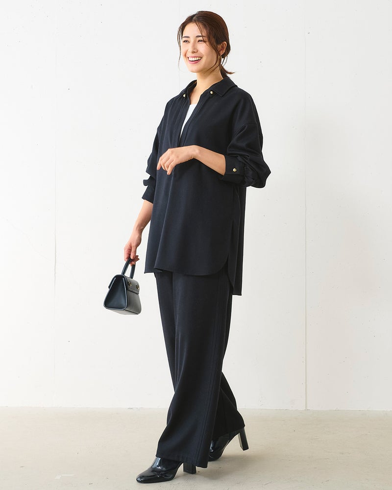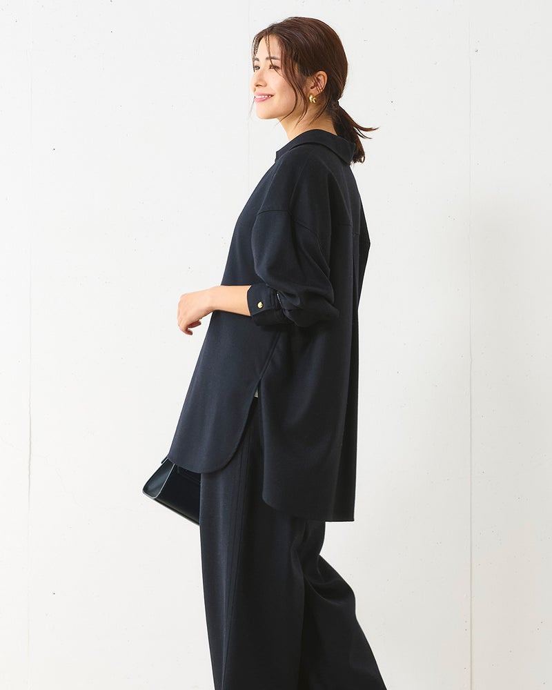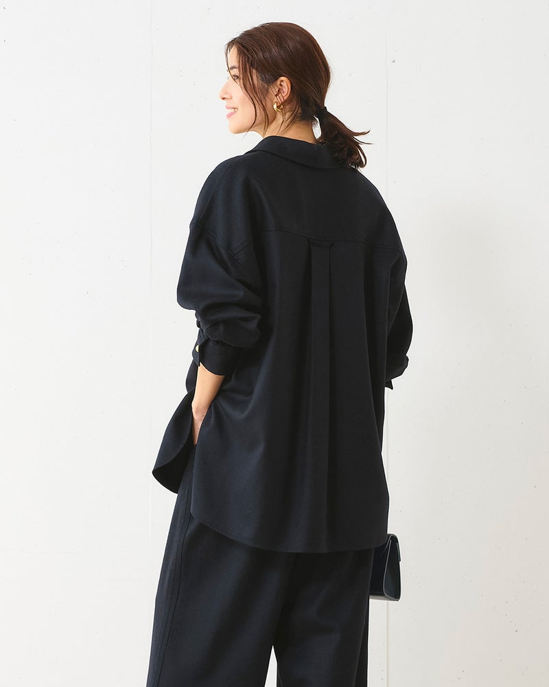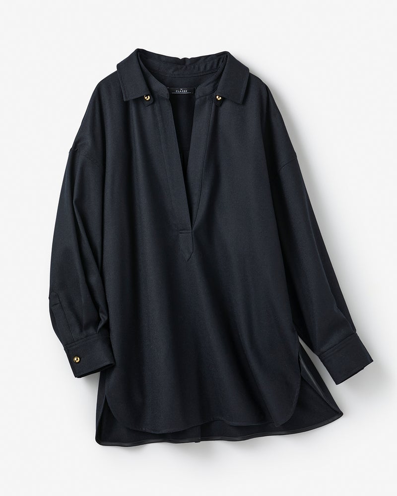 リュクスな素材を、あえてラフに着こなす。そんな大人の女性にこそ似合う着こなしを叶えるのが、なめらかな高密度フラノウールで仕立てたスキッパーブラウス。衿を抜いたリラクシーな雰囲気のオーバーサイズフォルム、同素材のパンツと合わせれば上質な休日スタイルに。アクセントの金ボタンはラフな着こなしに品を引き寄せてくれる。同素材のパンツ(商品番号 32196)とのセットアップもおすすめ。