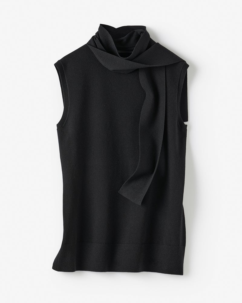 総針編み仕立てのハリ感が美しいノースリーブのボウタイニット。すっきり立ち上がるハイネックをベースにボウタイをプラスしたデザインは、結んで可憐に、ストール風に垂らしてクールに、気分や着こなしに合わせてアレンジできる優れもの。袖なしニットはジャケットのインにもおすすめです。
