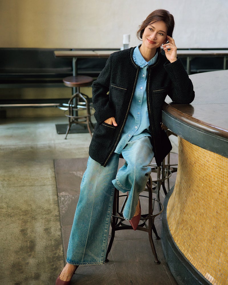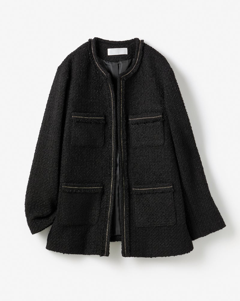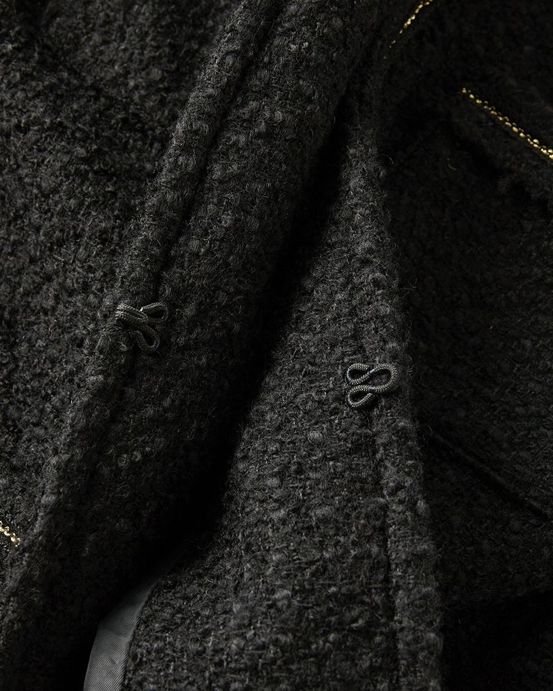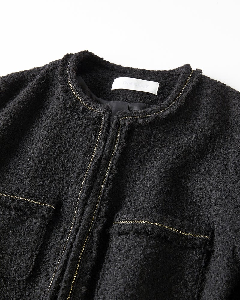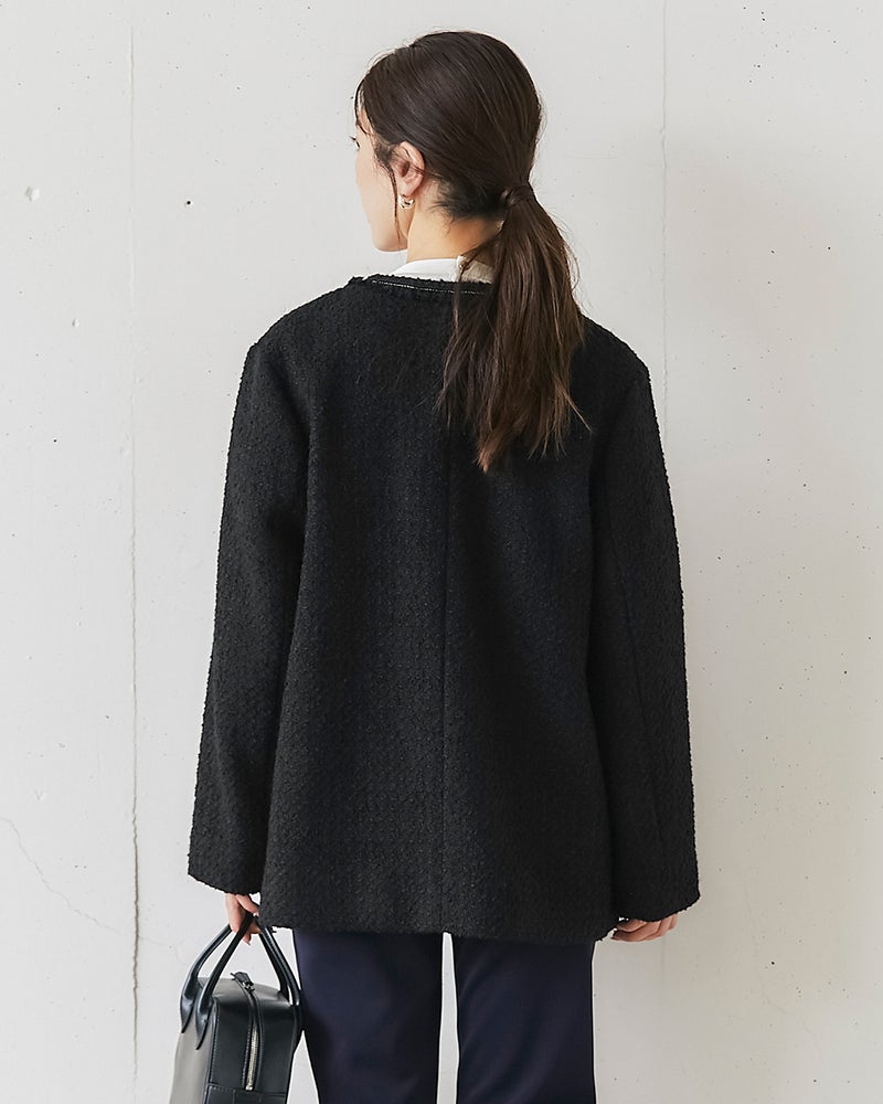 衿から前立て、ポケット口にあしらったメタルチェーンが、立居振舞にアクセのような煌めきをプラス。レディライクなツイードながら、長めの着丈がどこかハンサムでスタイリッシュ。お仕事もお出かけもかっこよく決まるジャケットです。