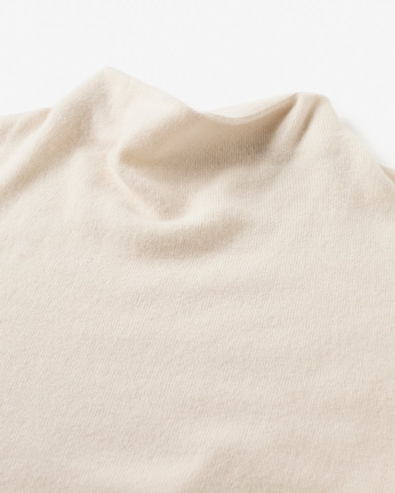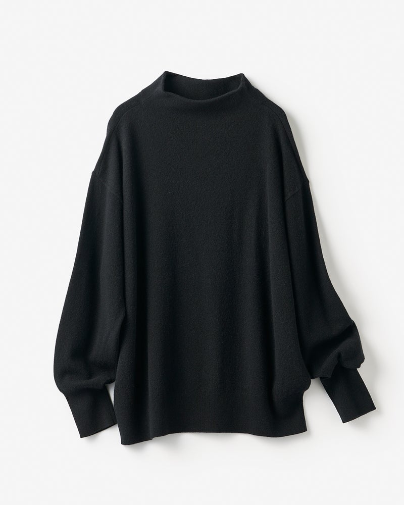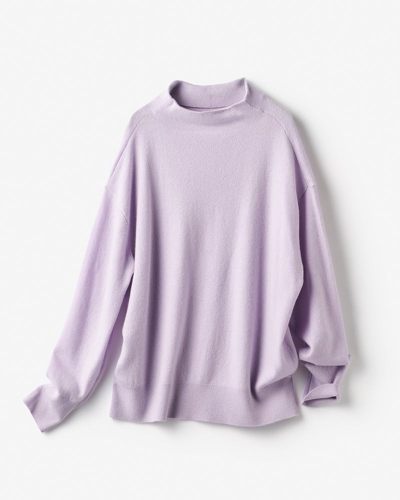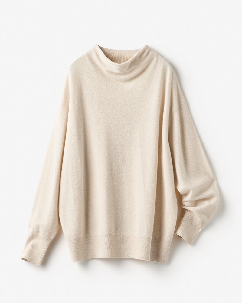なめらかで柔らかく、優しいぬくもりを実感できる、カシミヤを混紡したぜいたくニット。首まわりにゆとりのあるハイネックタイプは、衿もとにドレープが生まれ、1枚でも華のある着こなしに。コンパクトな丈感なので、合わせるボトムスを選びません。