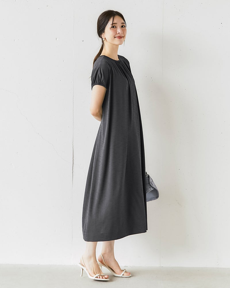 普段のサイズ:M 着用サイズ:M- 猛暑に着たくなる、さらさらとした肌さわりで。洗濯してもすぐ乾きしわになりません。とても小さくたためるので旅行にもピッタリです。 ワンピースのフレアーの裾も足さばきがよく、ストレスなく着用できます。 コーディネートを考えずにでパッと着て、出掛けられるので、1枚持っていると重宝します。ウエストマークするとお出掛け感が増し、ベルトなしでストンと着るのもどちらもいいです。