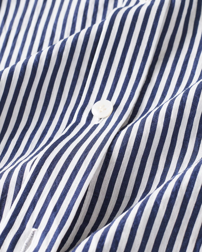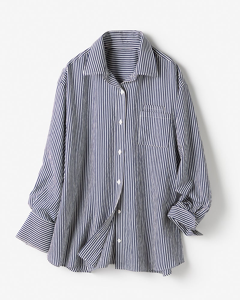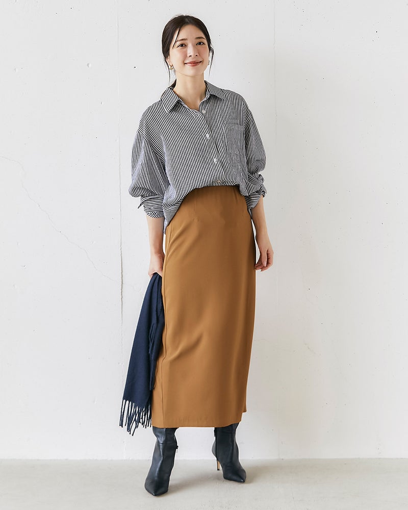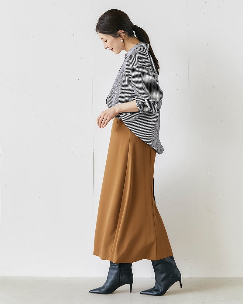 ストライプのシャツはいろいろ持っているのでスルーしていたのですが、着てみるとすごくおしゃれな感じ!少し薄手でコットン系のシャツとも、サテン系のテロテロとも違う印象になります。スカートやパンツにタックインしてもあまりかさばらないので、お腹まわりもモコモコせずすっきり。私は白、紺、黒のボトムスが多いのでブラウンが一番活躍しそうでブラウンにしましたが、他の色も欲しくなりました。
