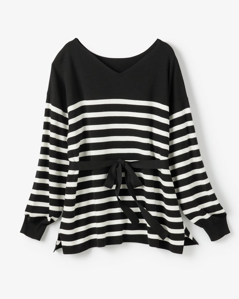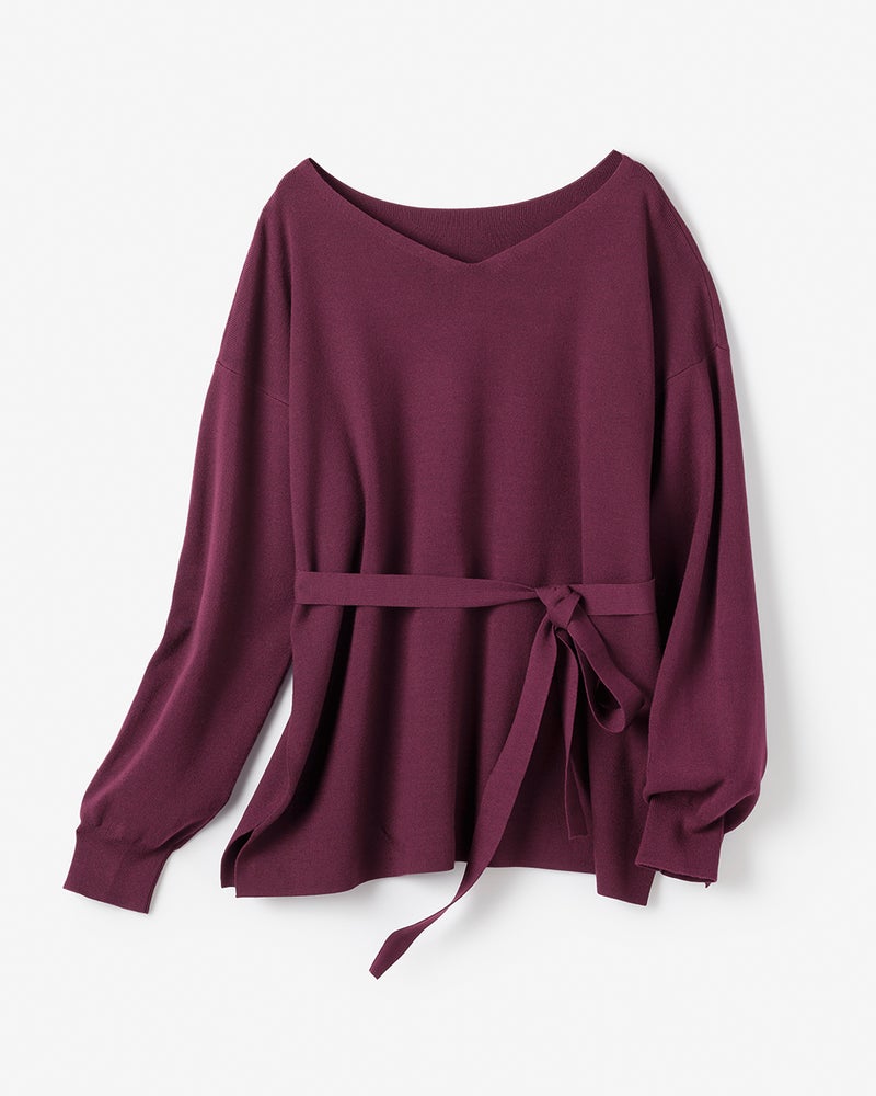 総針編みの美しいハリと優しい肌触りを両立したニットプルオーバーは、ボートネックとVネック、どちらを前にしても着られる2WAYデザイン。共布のリボンベルトでシルエットアレンジもでき、1枚で多彩な着回しを楽しめます。