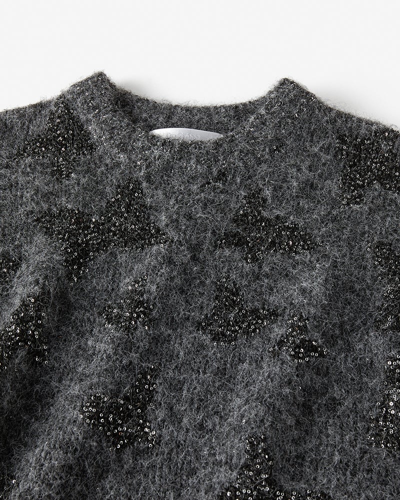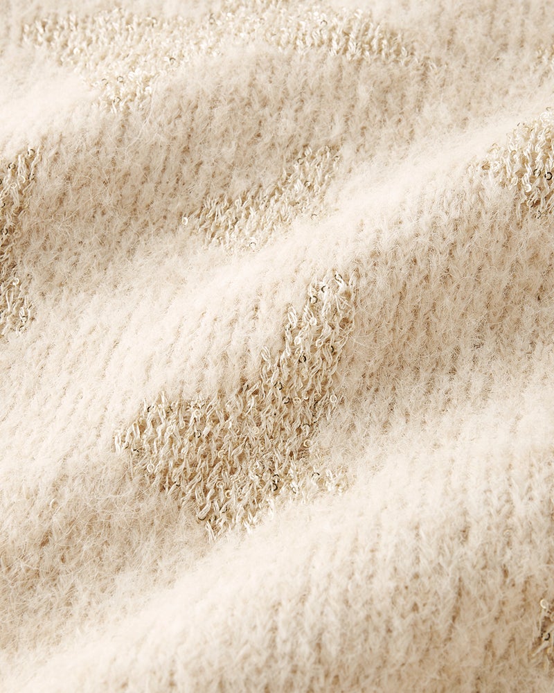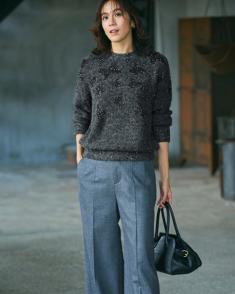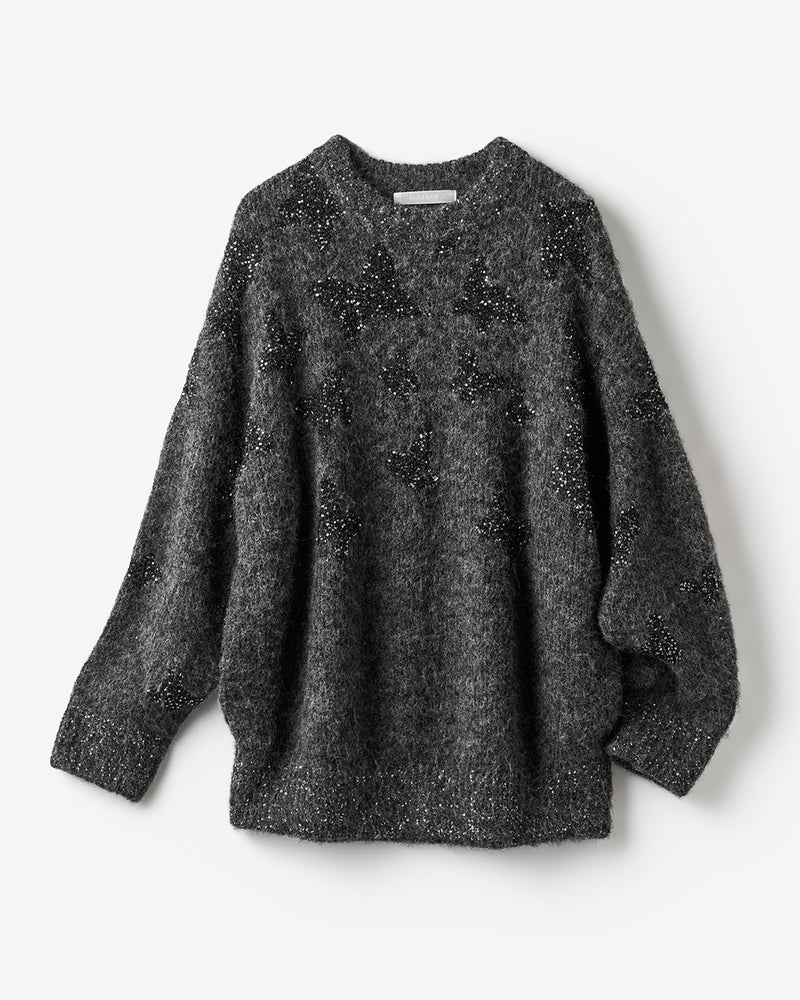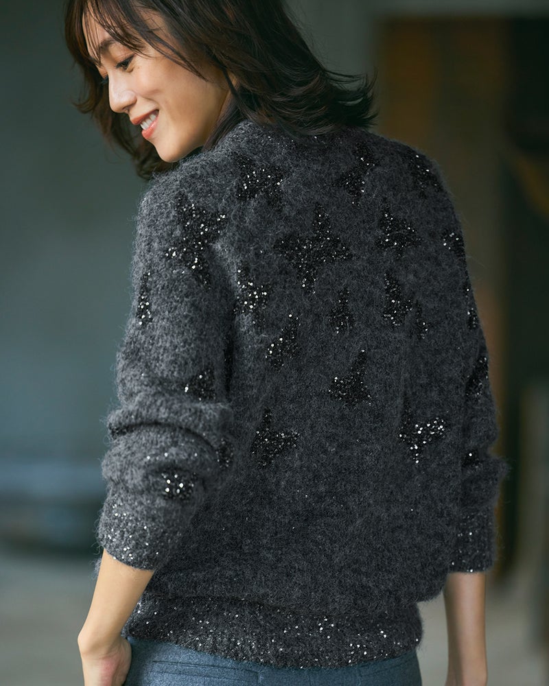 蝶々の柄を編み込んだもっちり弾力のあるジャカードニットに、小さなスパンコールをちりばめました。蝶々の柄とネックライン・袖口・裾にはスパンコールをたっぷり、全体にはほんのり、コントラストを効かせています。ウール混の暖かな風合いと、軽く優しい肌あたりを追求。つまり気味のクルーネックが今っぽく、パンツコーデもスタイリッシュに決まります。