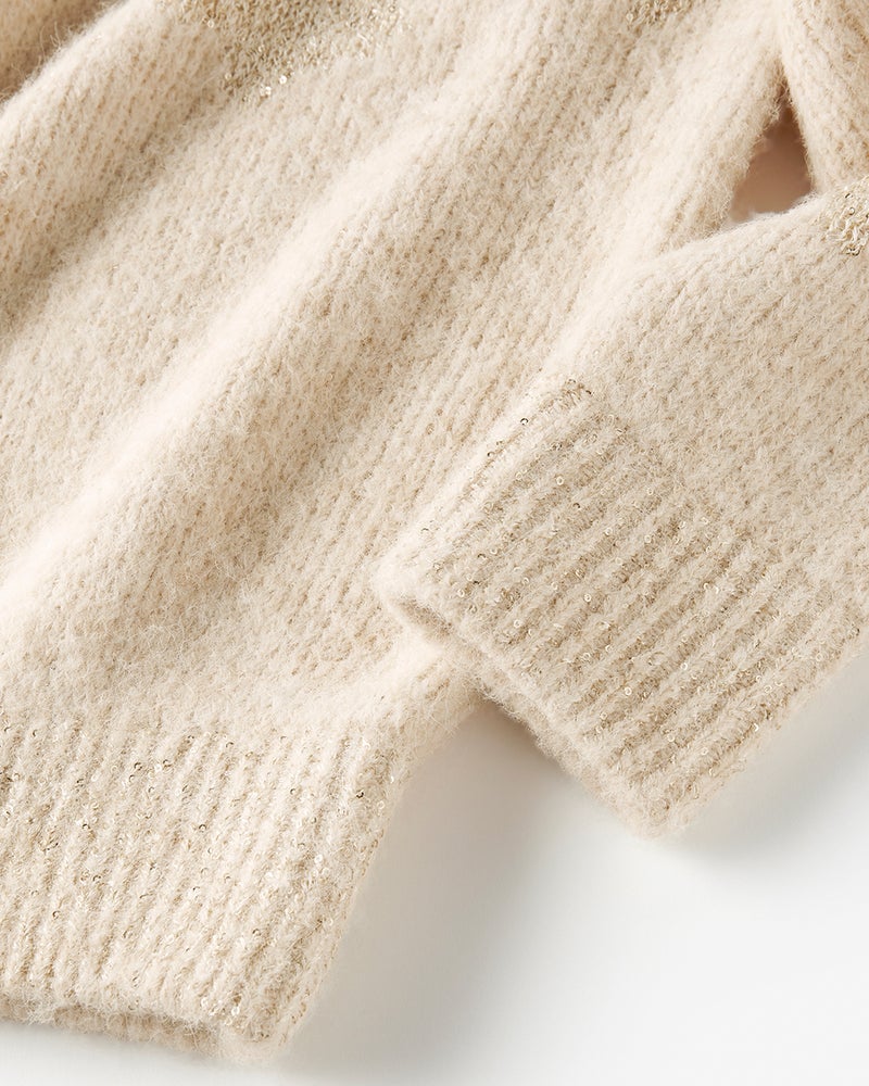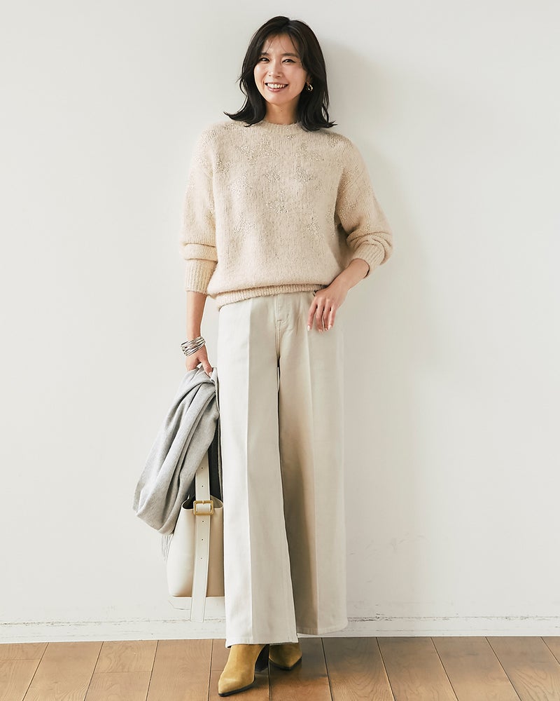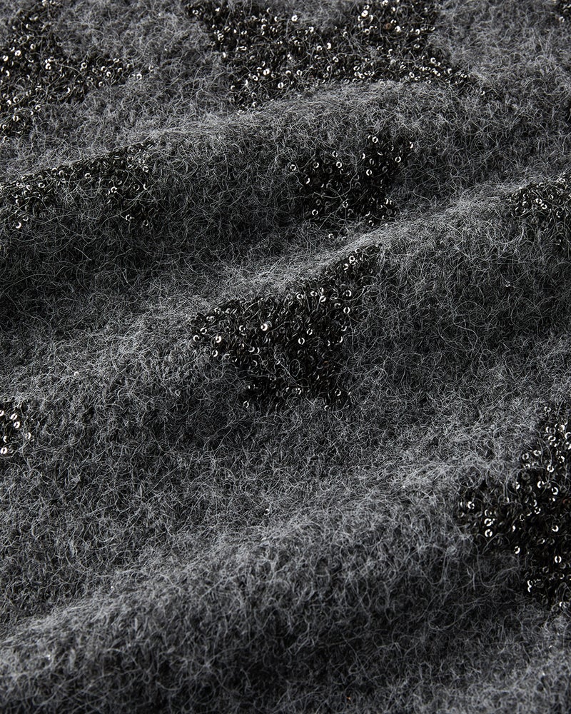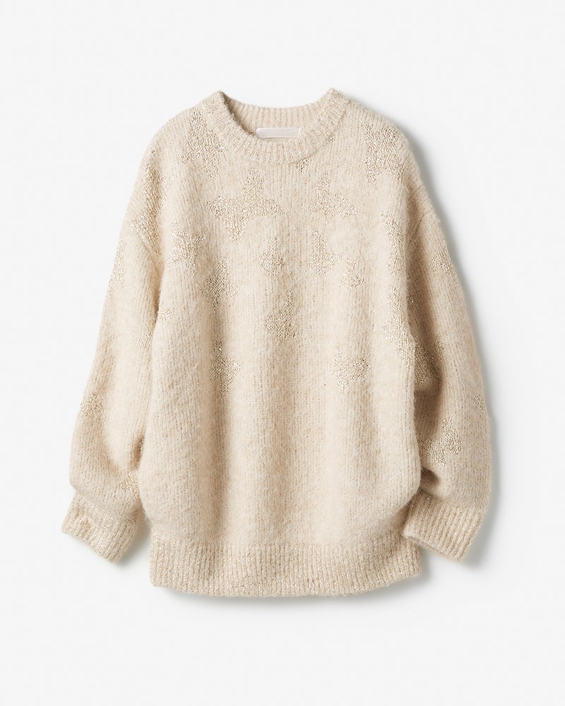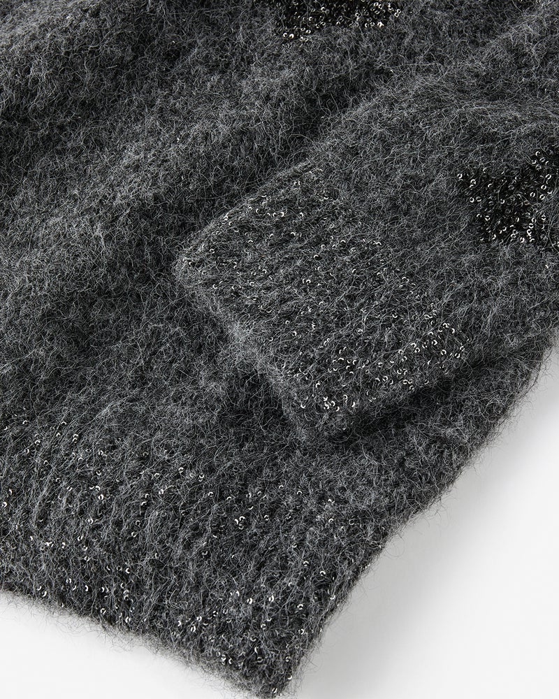 蝶々の柄を編み込んだもっちり弾力のあるジャカードニットに、小さなスパンコールをちりばめました。蝶々の柄とネックライン・袖口・裾にはスパンコールをたっぷり、全体にはほんのり、コントラストを効かせています。ウール混の暖かな風合いと、軽く優しい肌あたりを追求。つまり気味のクルーネックが今っぽく、パンツコーデもスタイリッシュに決まります。