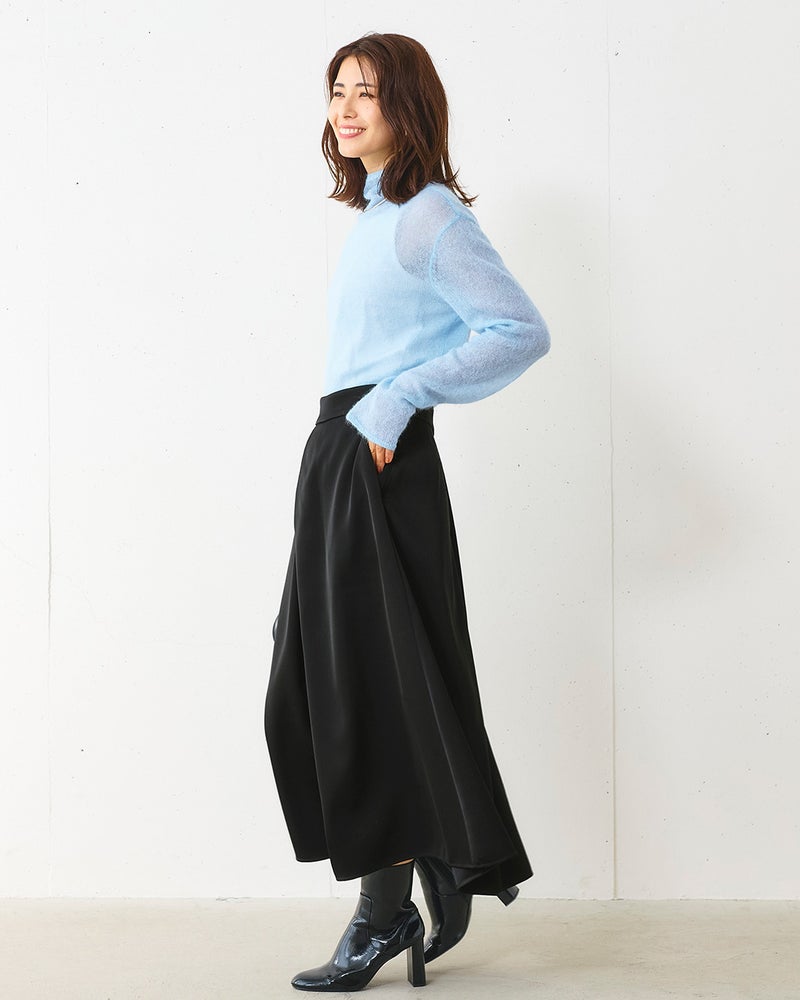 - 今季も継続のシアートレンドを取り入れるなら、こんなニットがおすすめ。若いアンゴラ山羊からとれる、スーパーキッドモヘアをたっぷりブレンドした糸を使用。柔らかな肌ざわりと羽衣のような軽やかさは、大人にこそふさわしい上質感です。