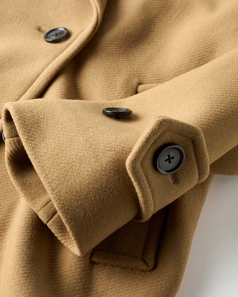 上品でいて着こなしを選ばないピーコートを、ほどよいオーバーサイズフォルムで今っぽく着こなせるデザインに。素材は軽い着心地と綾目の美しさが特長のウール混カルゼ。衿もとをしっかり閉じられるチン(あご)ベルトや袖口のカフスベルトの本格ディテールで大人のための1着に仕上げました。