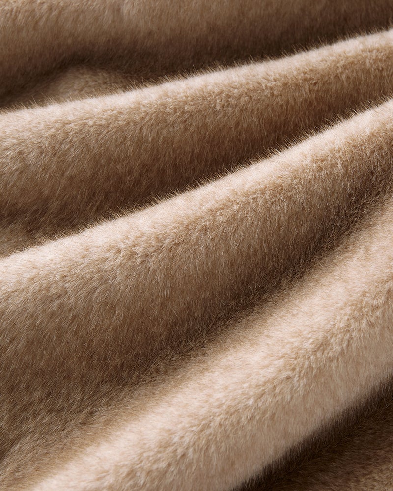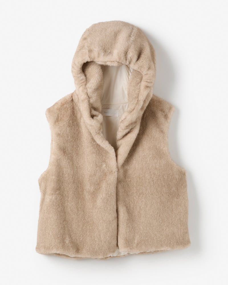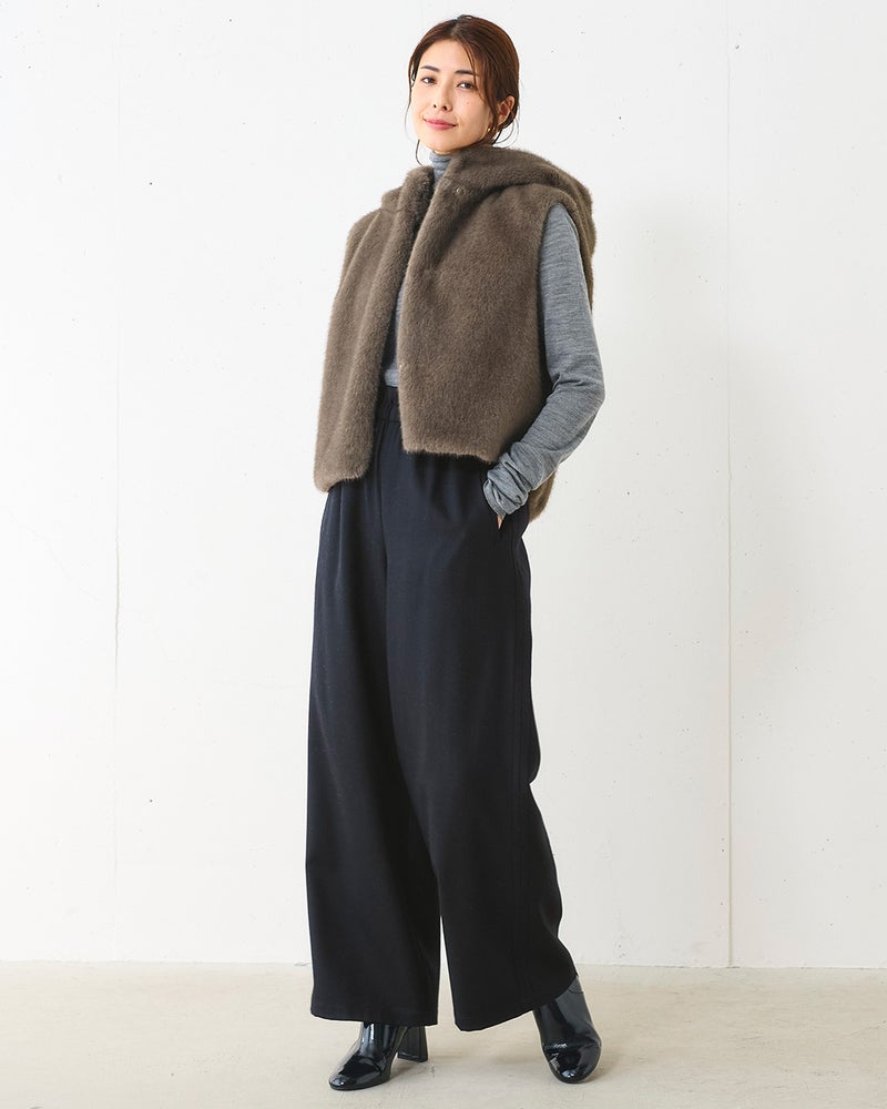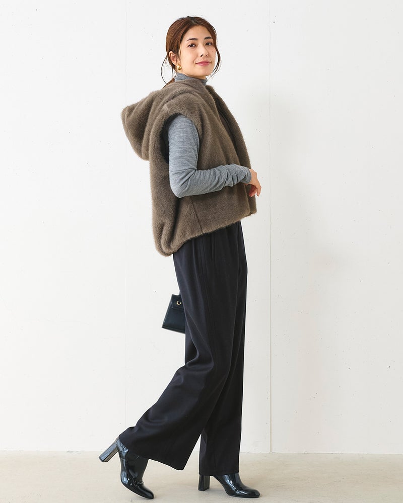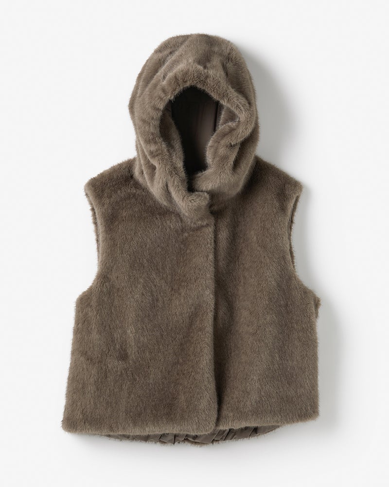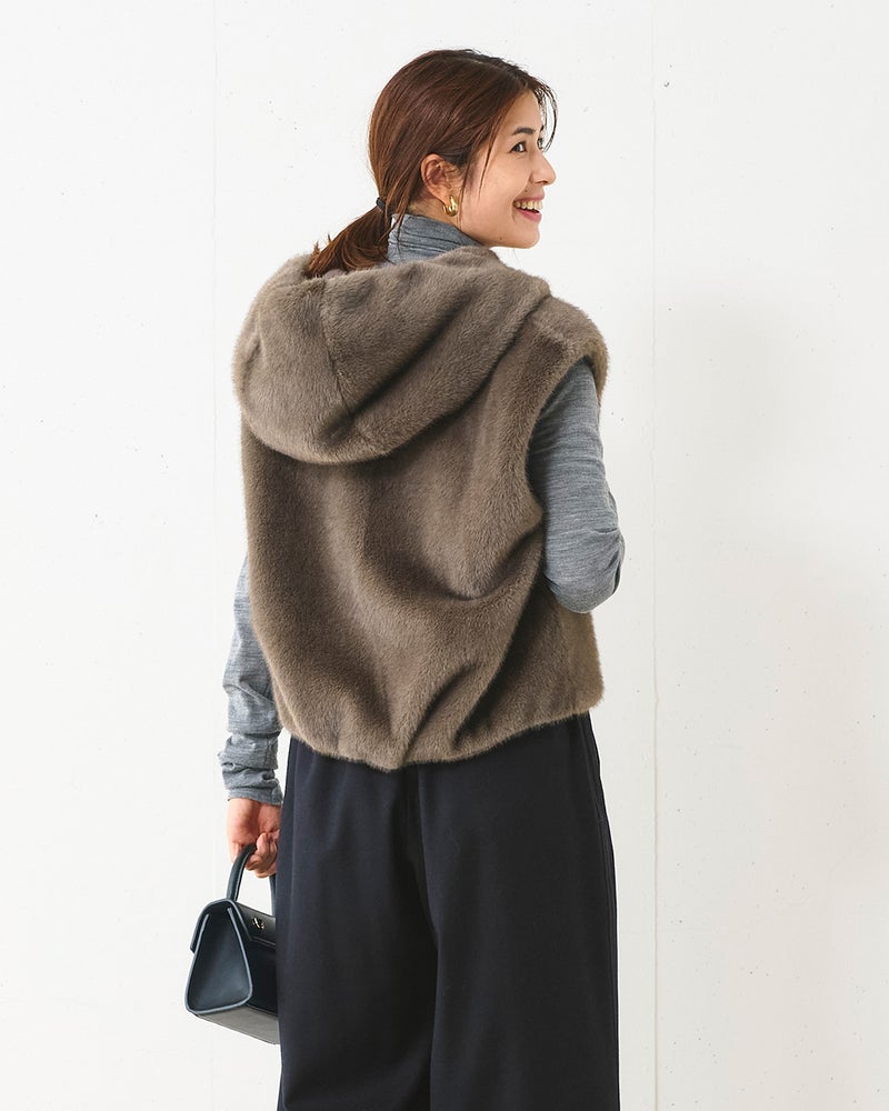 - 秋は1枚で、冬はコートインで。お洒落のアクセント防寒の両方を叶えてくれるのが、こんなミンクタッチファーのフードジレ。首まわりをふんわり覆うスタンドカラー風のネックデザインや、やや短めのコンパクト丈でバランスよく着こなせるファーアイテムに仕立てました。