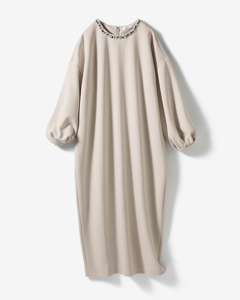 光沢カットソーで仕立てた、コクーンシルエットのシックでモードなワンピース。ネックラインにはビジューを敷きつめて、顔映り華やかに。ボリューム控えめのパフスリーブが、女性らしく上品なデザインです。素材には、2枚の布をダンボールの断面のように継ぎ合わせた光沢カットソー素材を採用。薄手でもふっくら軽く、ハリ感があり、体型をカバーしながら華奢見えを叶えます。