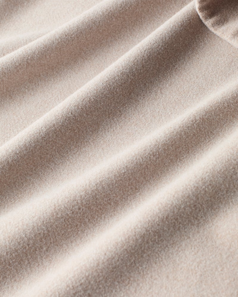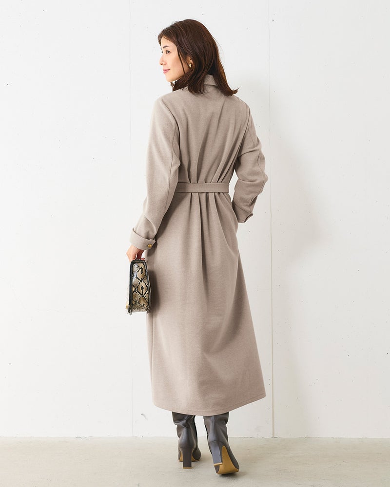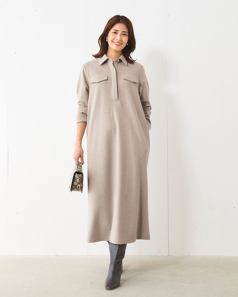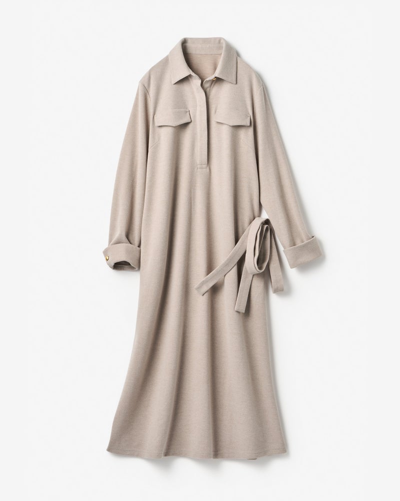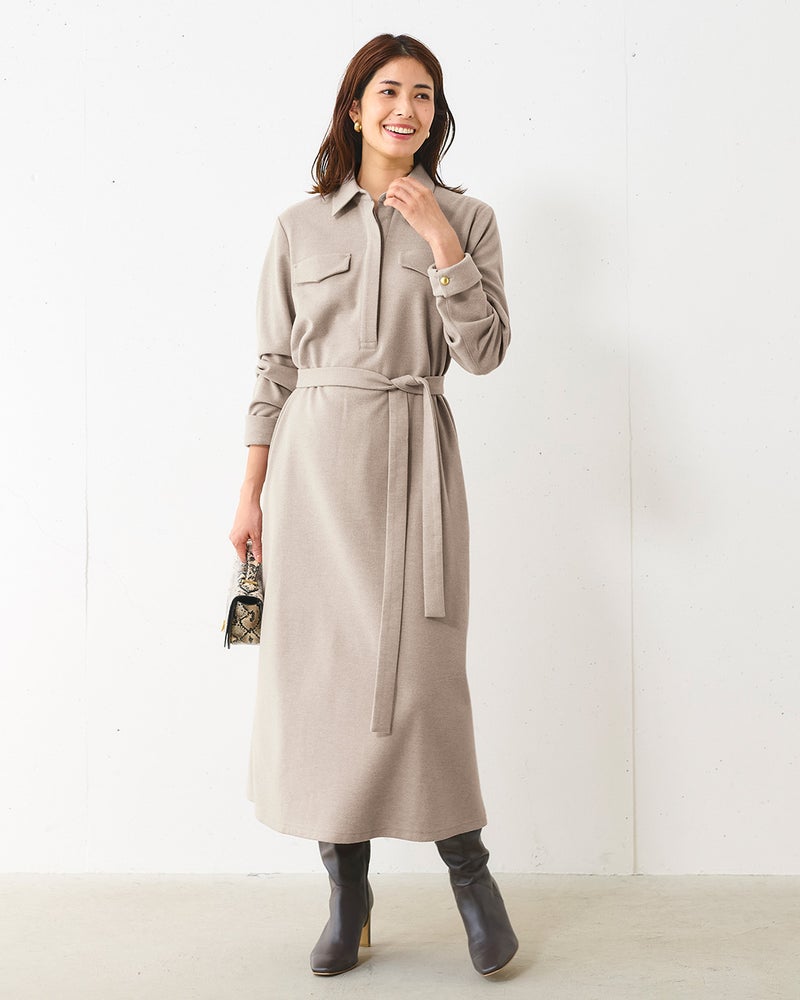 - 比翼仕立てのスキッパー衿やフラップポケットなどハンサムなシャツのディテールを取り入れながら、温かみのあるウールライク素材でレディに仕立てたワンピース。インナーとのレイヤードで衿元の印象チェンジや、共布ベルトでシルエットの変化も楽しめます。