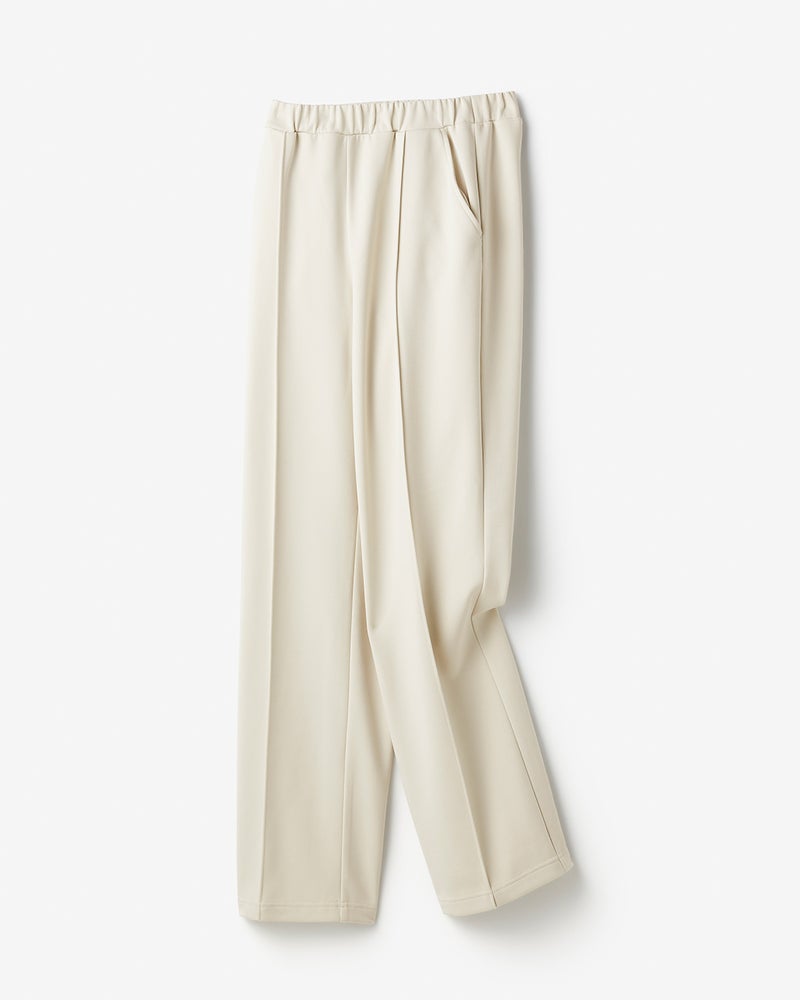 見た目は上質な布帛ライクな質感ですが、実はぐんと伸びるジャージー素材。縦横斜めの自在ストレッチで、歩いても、しゃがんでも、長時間着用もOKの心地よさを実現。