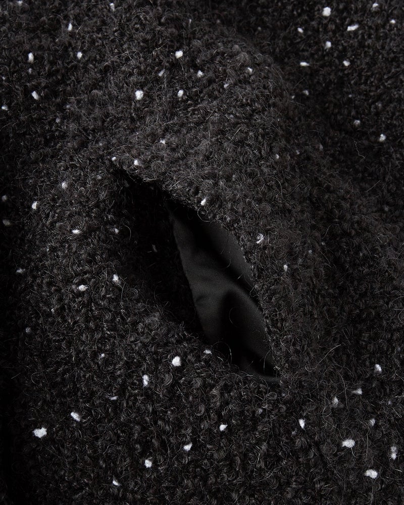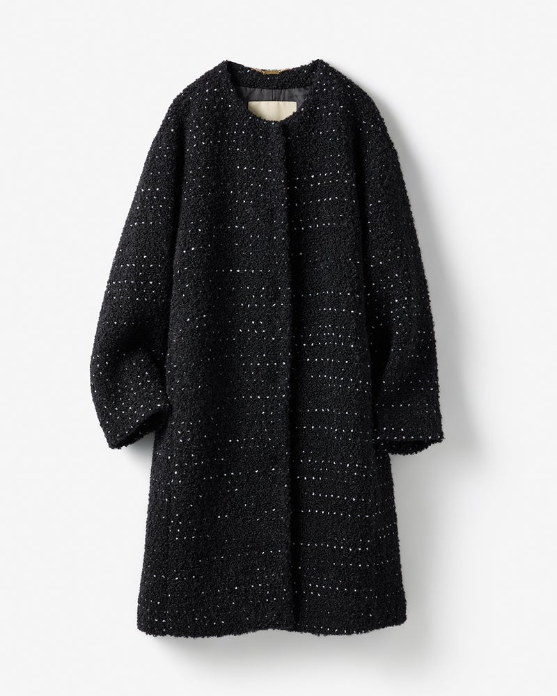 ノット(結び目)糸をミックスしたファンシーツイードのノーカラーコート。クラシカルなツイード素材をリラクシーなサイズ感に仕立てたことで、かっちりしすぎず今の気分で着こなせます。どんなコーディネートもシックに仕上げる黒×白のモノトーンベース。インナーを選ばず、ストールなどの巻き物が映えるノーカラーも魅力です。