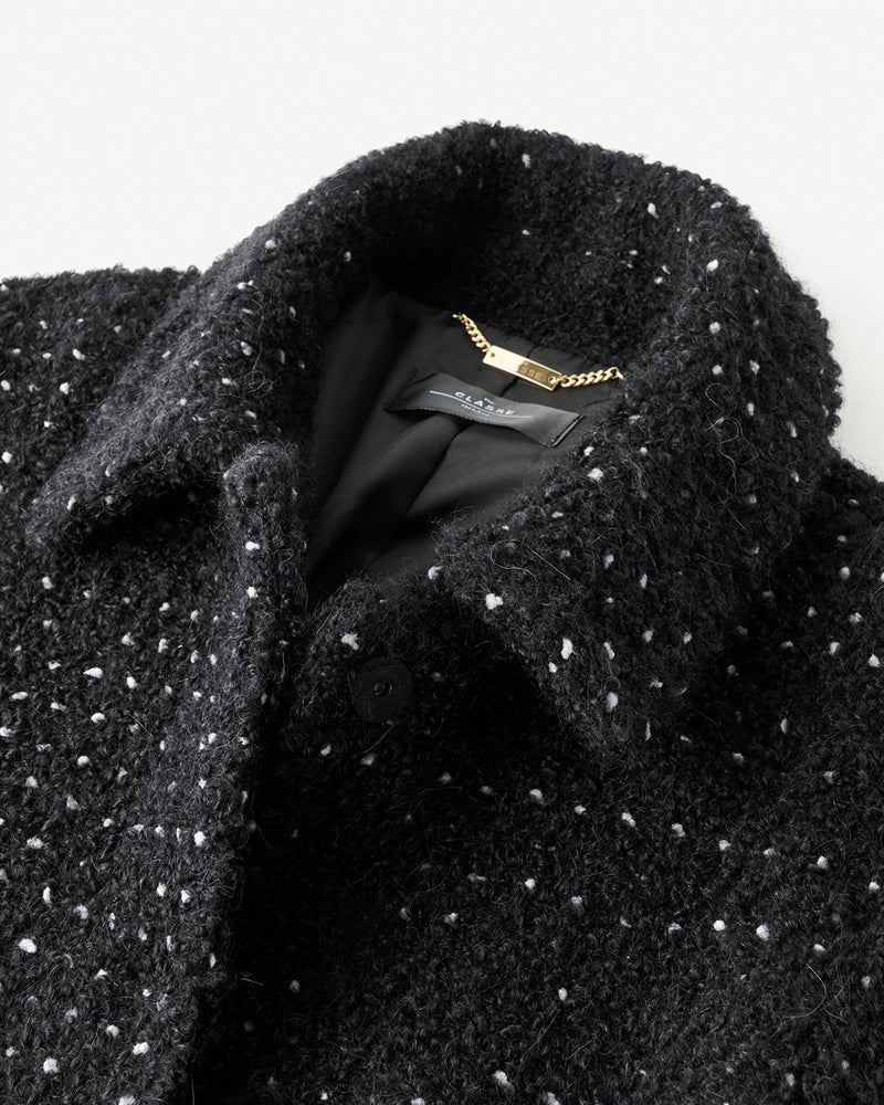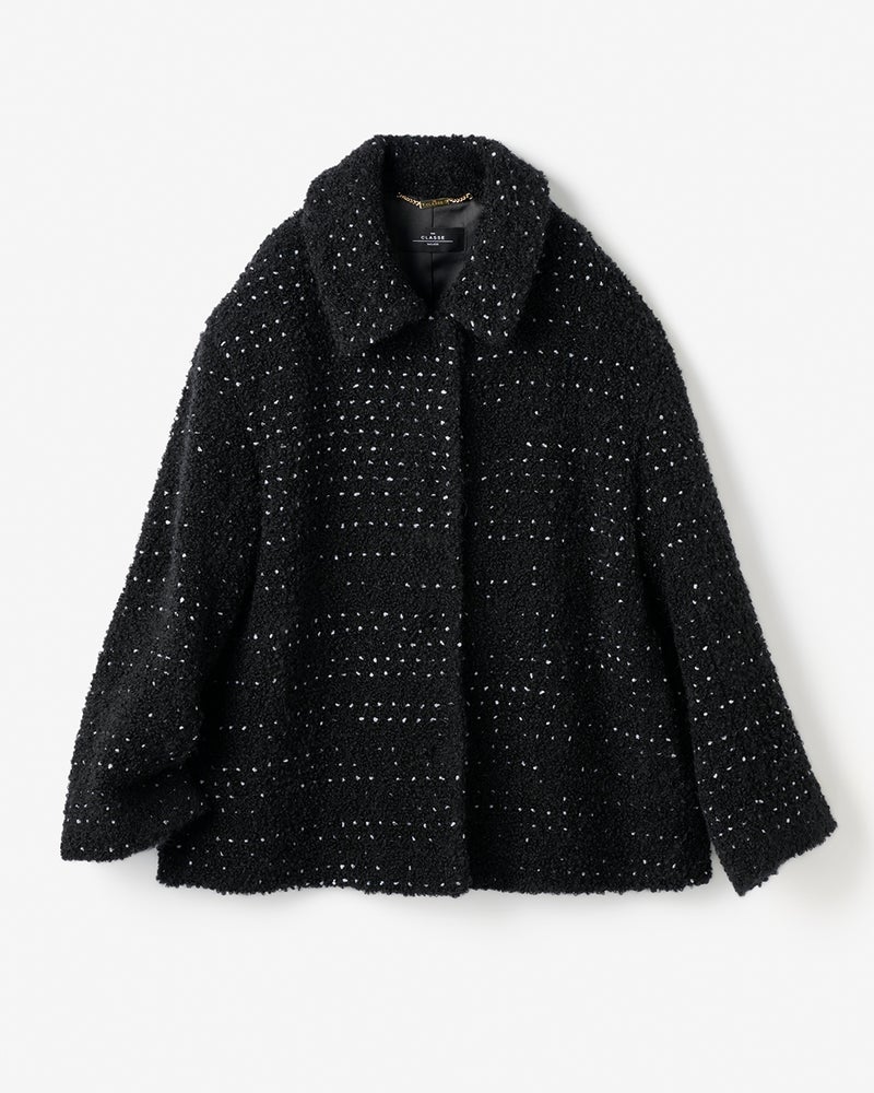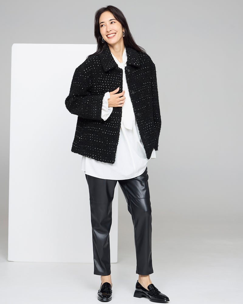 ノット(結び目)糸をミックスしたファンシーツイードのジャケット。ドロップショルダーのゆったりシルエットが、ツイードジャケットのかたさを感じさせず軽やかに着こなせます。黒×白のシックなモノトーンは、マニッシュにもフェミニンにも合わせるボトムでイメージ自在。