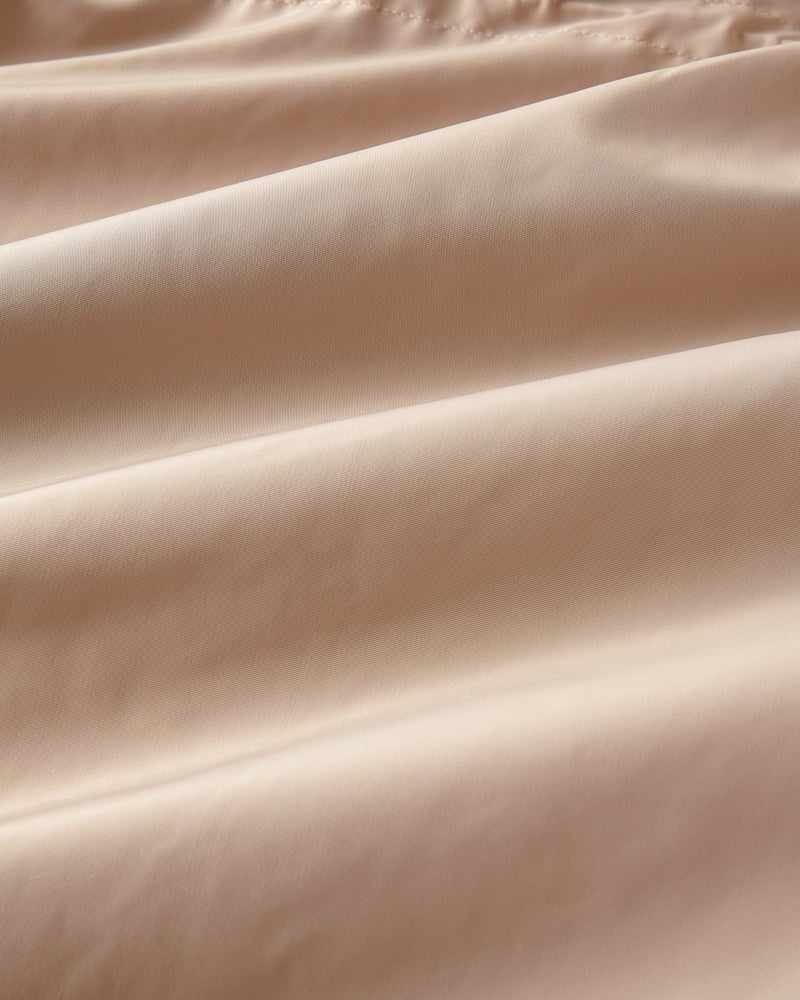 - 生地に光沢感が有り、首周りの立ち上がりが良い。全体的にスッキリ見える。フードが襟のように見える2way仕様も気に入ってます。