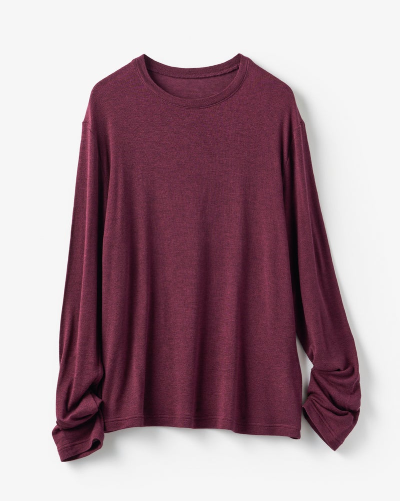 やさしさにこだわりましたふわりと素肌にとろけるような柔らかさの秘密は、天然由来のセルロースと極細ウールをミックスした贅沢素材の力。身体のラインを拾うことなくすっきりしたシルエット、ほのかな透け感で秋冬の重ね着を軽やかに仕上げます。 - 重ねて、1枚で。