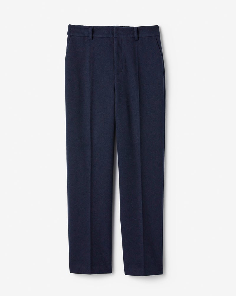- ヒップ位置は高く、脚はスラリと見せる立体カッティング「ワンサイズ細く、脚長に見せたい」。そんな願いを叶えるのが、立体裁断のエキスパートの手によるこだわりのカッティング。ヒップラインは上向きに小さく見せっつ、膝の位置を高めに設定することで膝下に長さを出し、360度どの角度からも立ち姿を美しく見せてくれます。