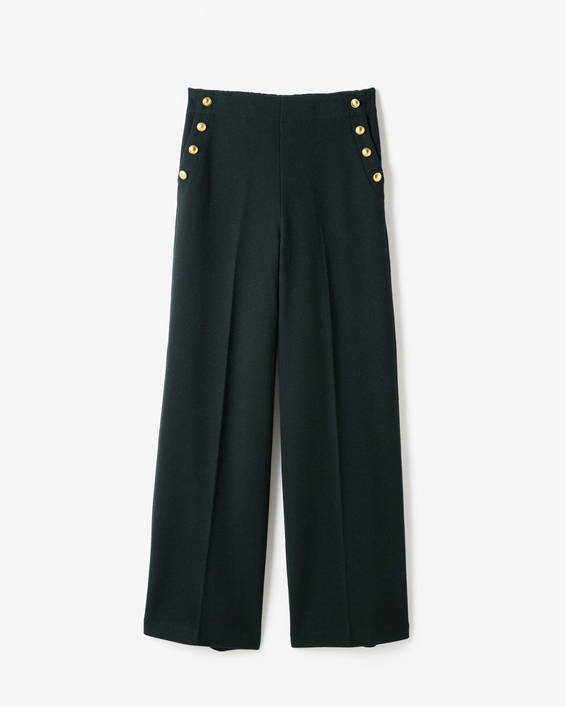 とても素敵な色でどんなアウターにも合います。暖かい素材で足も長く見えてこの冬重宝しそうです。金ボタンについては好き嫌いがあるかもしれませんが私はアクセントになって良いと思いました。