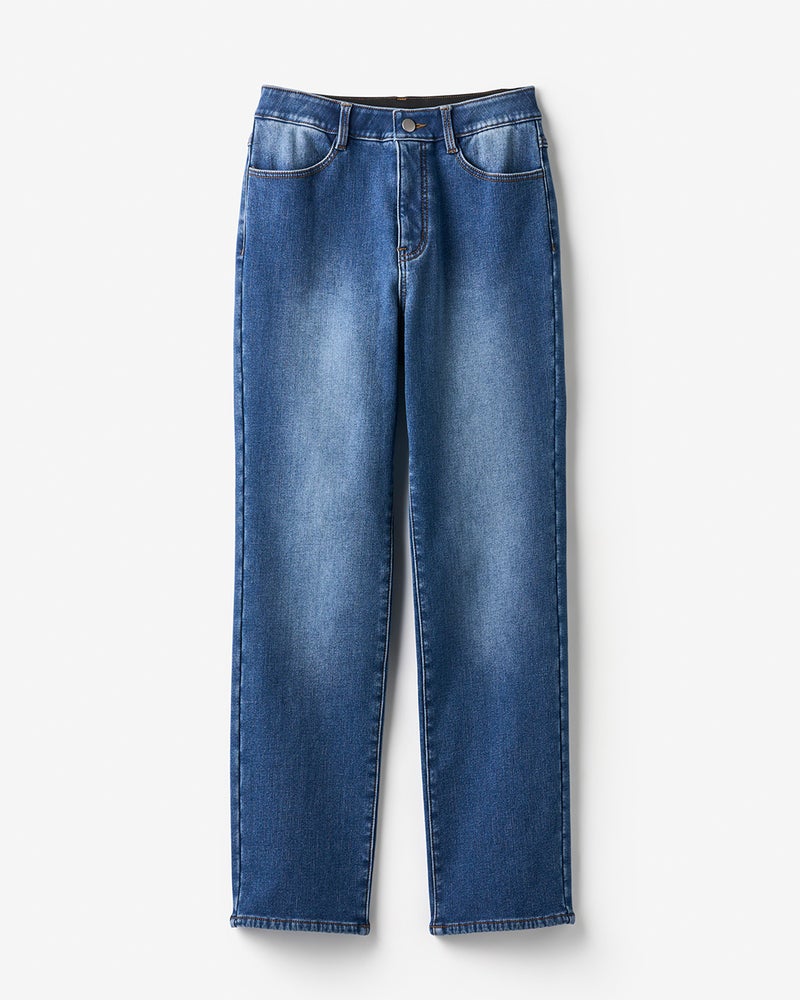 伸び伸びストレッチ、とろける肌触りの裏ベロア素材素材には、本格派デニムの色落ちカラーを再現した、柔らかなストレッチ生地を使用。その名の通り、デニムの裏になめらかな毛足のベロア素材を貼りつけることで、冬場もOKの暖かな風合いに仕上げました。
