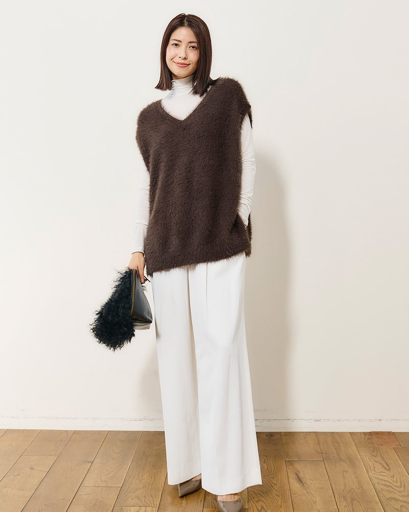 普段のサイズ:M 着用サイズ:M - ふわふわしたニットベストを探していたところこちらの商品を見つけました。思ったより軽くて触り心地も良く暖かいです。丈が少し長めなのでお腹まわりが隠れるのも助かります。年末の集まりにきれいめのロングスカートと合わせたり、ワイドパンツと合わせてカジュアルにも着たいです。
