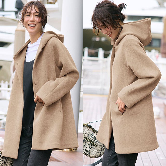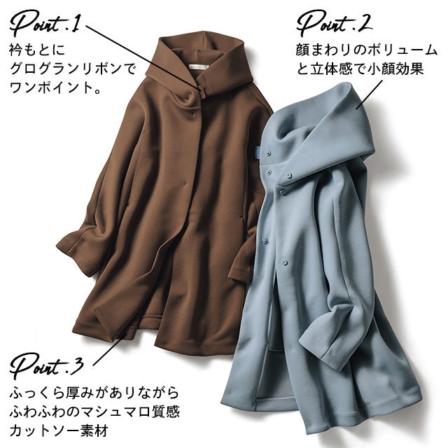 「着ていることを忘れる軽さ!」と、昨年大好評をいただいた「ふわラク」コートが今年も登場!立体フードの小顔効果はそのままに、全体のシルエットをややコンパクトに&しっかりと前を閉じられるボタンを追加してますます進化を遂げました。