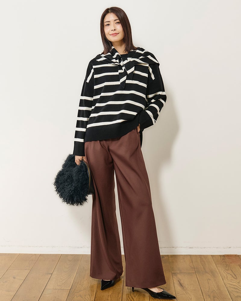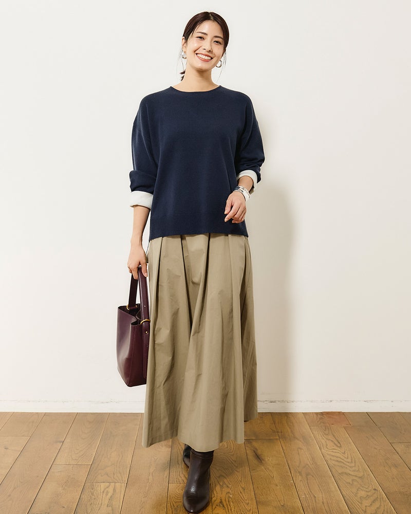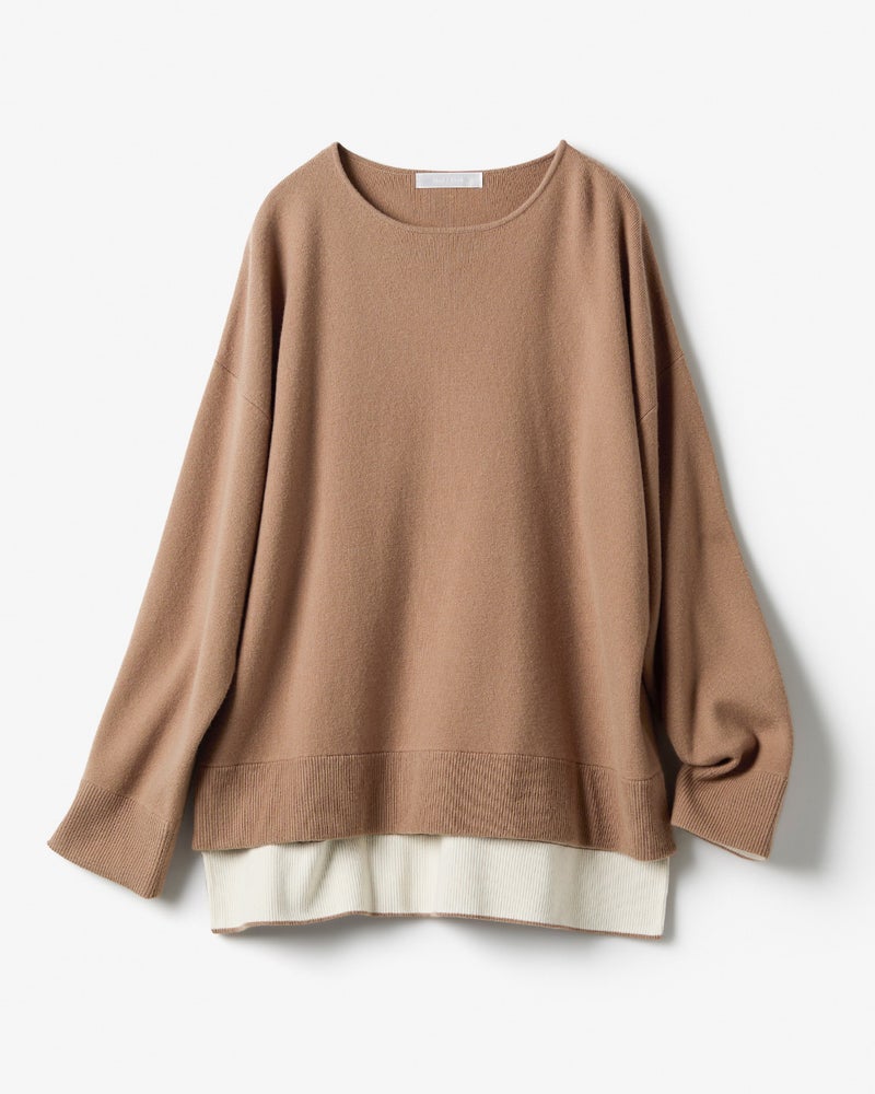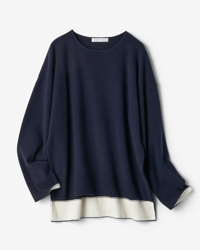 スウェットライクな今どきフォルムを、上質なウール混ニットで仕立てた大人の冬カジュアルにぴったりの1着。袖裏と裾は異なるカラーを配したバイカラーデザインで、1枚で着映えるアイテムに。同素材のニットスカーフ(商品番号32509)をさらっと纏ってフレンチシックに着こなして。