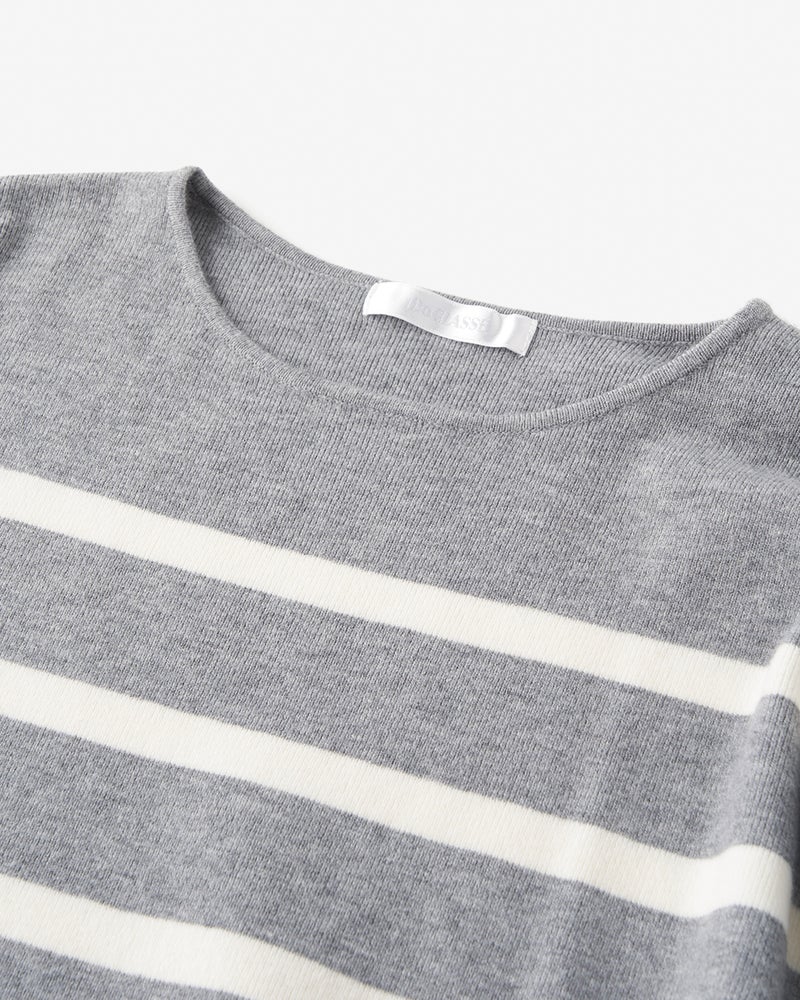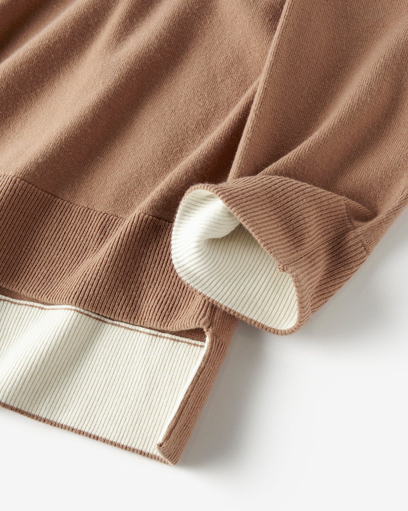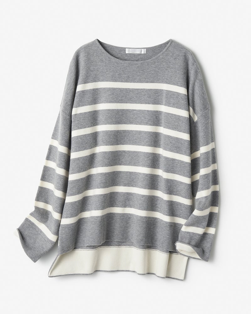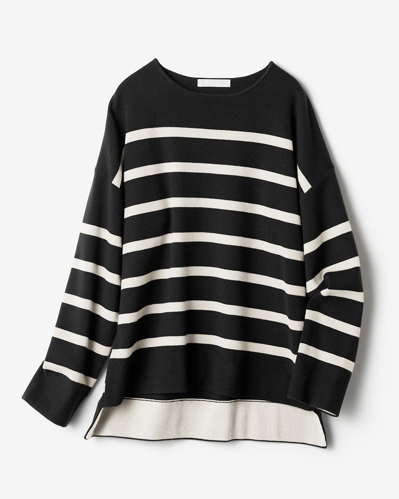 スウェットライクな今どきフォルムを、上質なウール混ニットで仕立てた大人の冬カジュアルにぴったりの1着。袖裏と裾は異なるカラーを配したバイカラーデザインで、1枚で着映えるアイテムに。同素材のニットスカーフ(商品番号32509)をさらっと纏ってフレンチシックに着こなして。