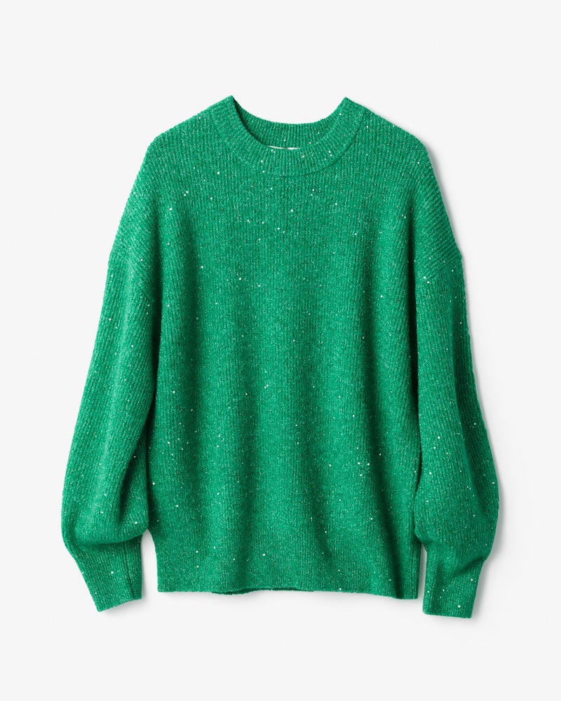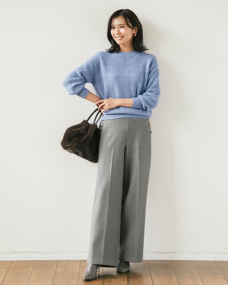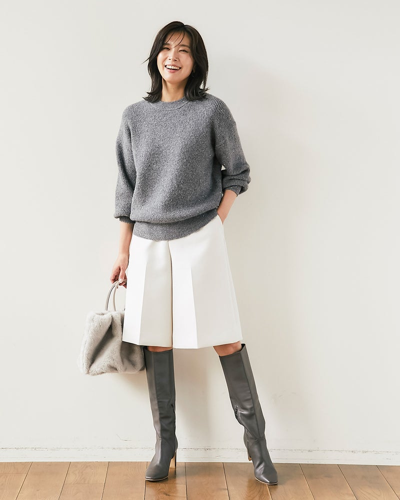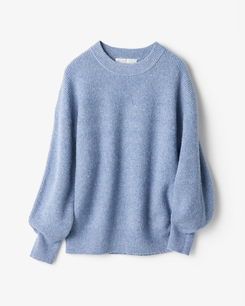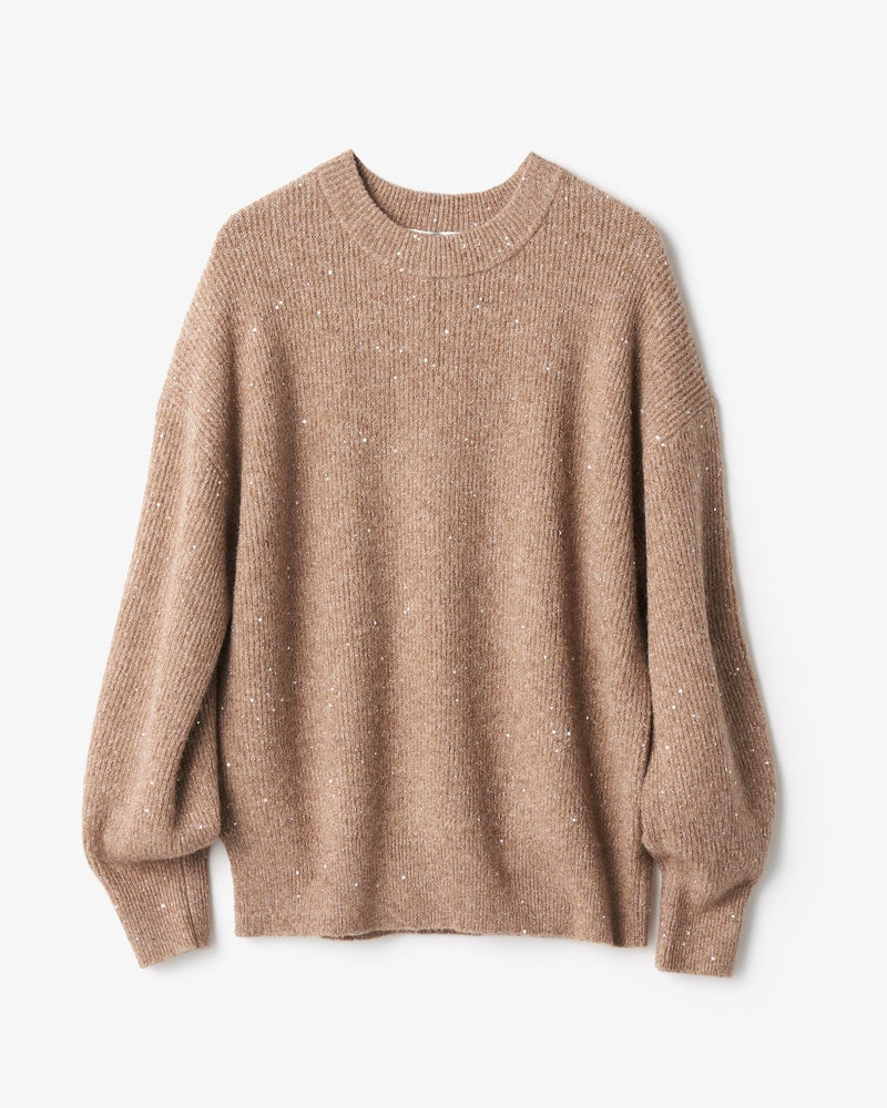 秋冬の着こなしが1着でパッと華やぐ、ラメ糸×スパンコールを編みこんだウール混セーター。片畦編みでハリのある質感は、1枚でも重ね着でも活躍。繊細な極細ラメ糸と星屑のような極小スパンコールを使用し、肌に触れた時もちくちくしないよう丁寧に仕立てました。ゆったり仕立てた片畦編みのクルーネックは、デニムやシンプルなスカートに合わせてもカジュアルスタイルを格上げ。