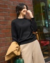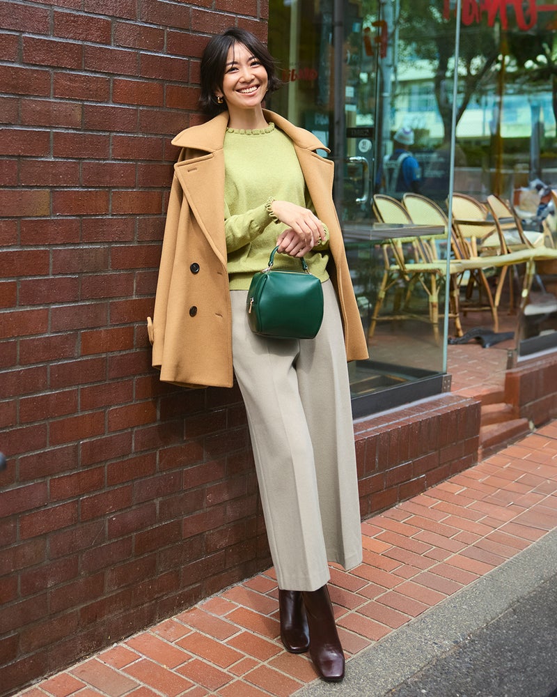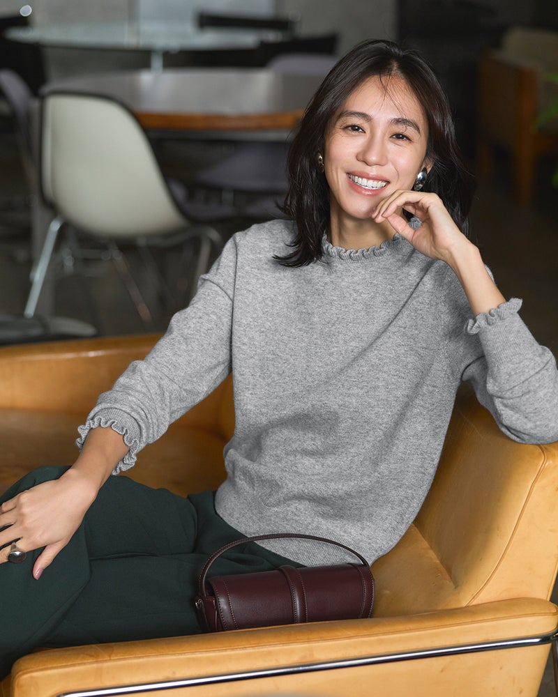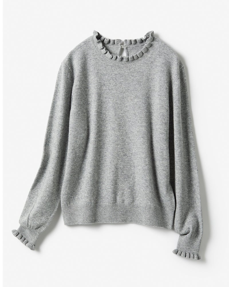 リブと片畦を組み合わせて作ったフリルが、顔まわりを大人可愛く彩るセーター。袖口にも、コートを着た時にチラリとのぞくフリルをあしらいました。背中の涙開きにはパールボタンを添え、後ろ姿にも上品さをプラス。ウール混のぬくもり感ある着心地にも癒されます。