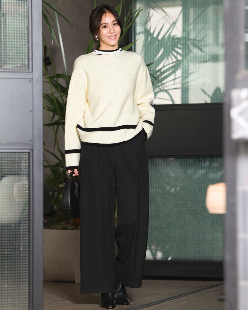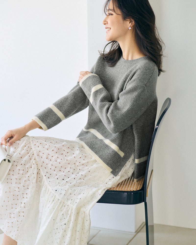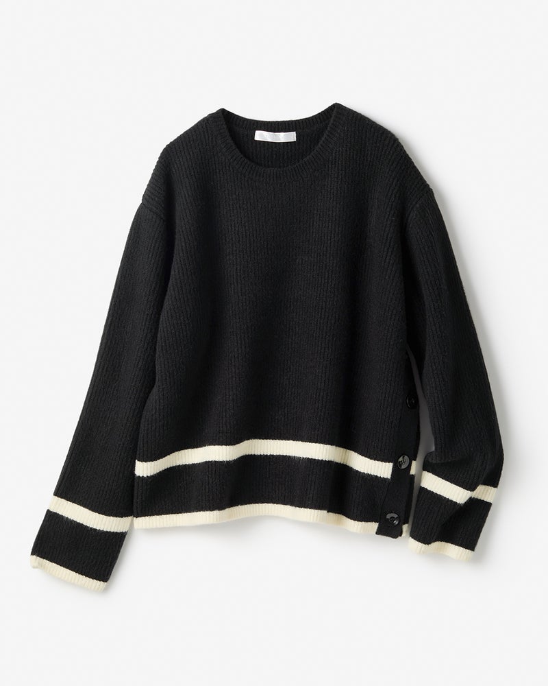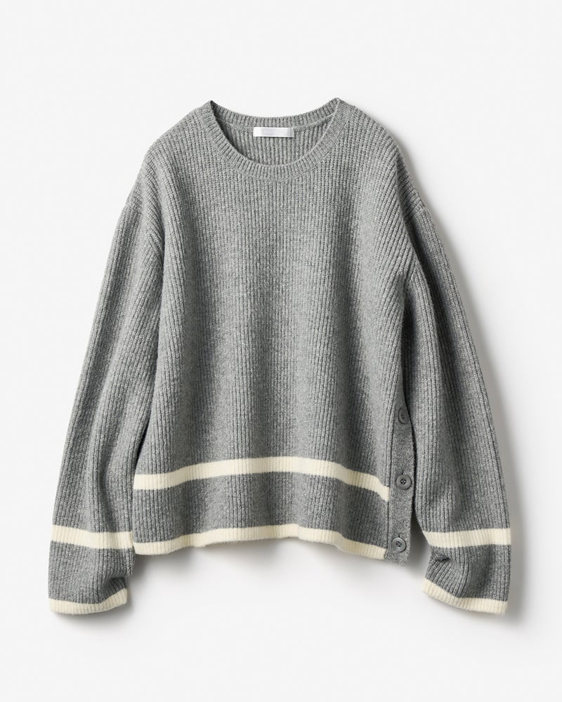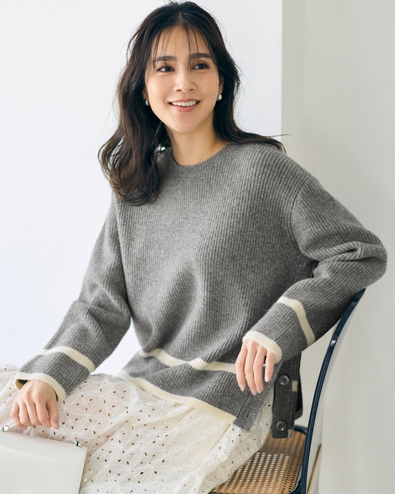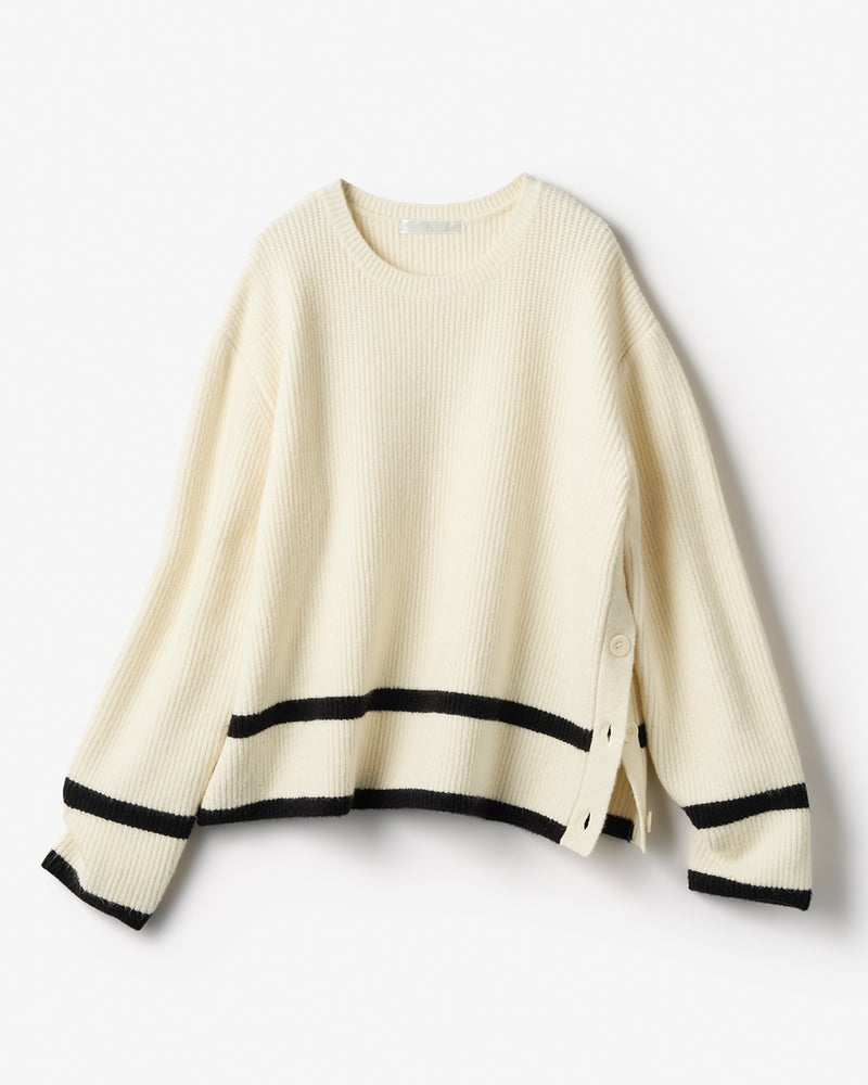 もちっとしたウール混の片畦編みニットを、さっと1枚で着映えるプルオーバーに仕立てました。ゆったりした抜け感シルエット×サイドボタンが開閉できる片側スリットデザインで、シンプルだけどお洒落な雰囲気に。袖口・裾にはボーダーのラインを効かせて、1枚でお洒落スタイルが完成。