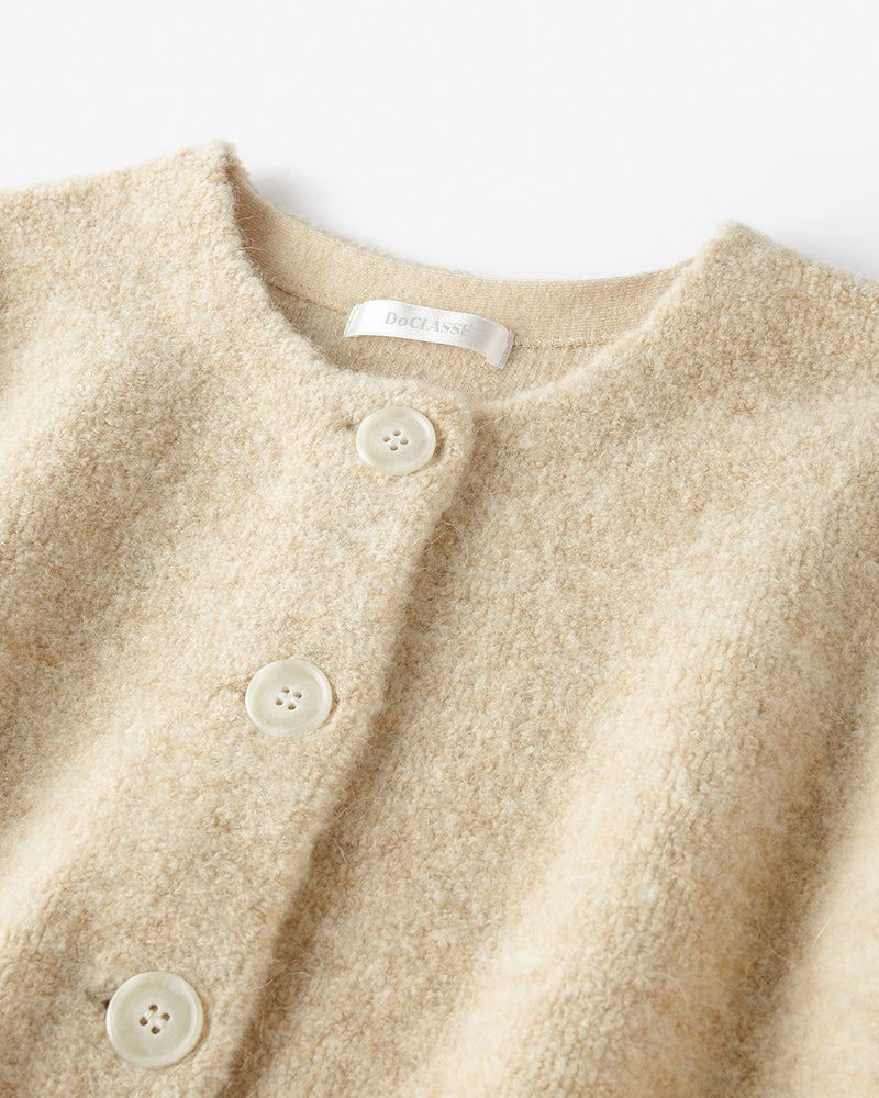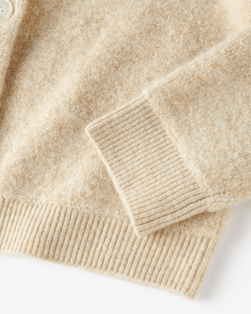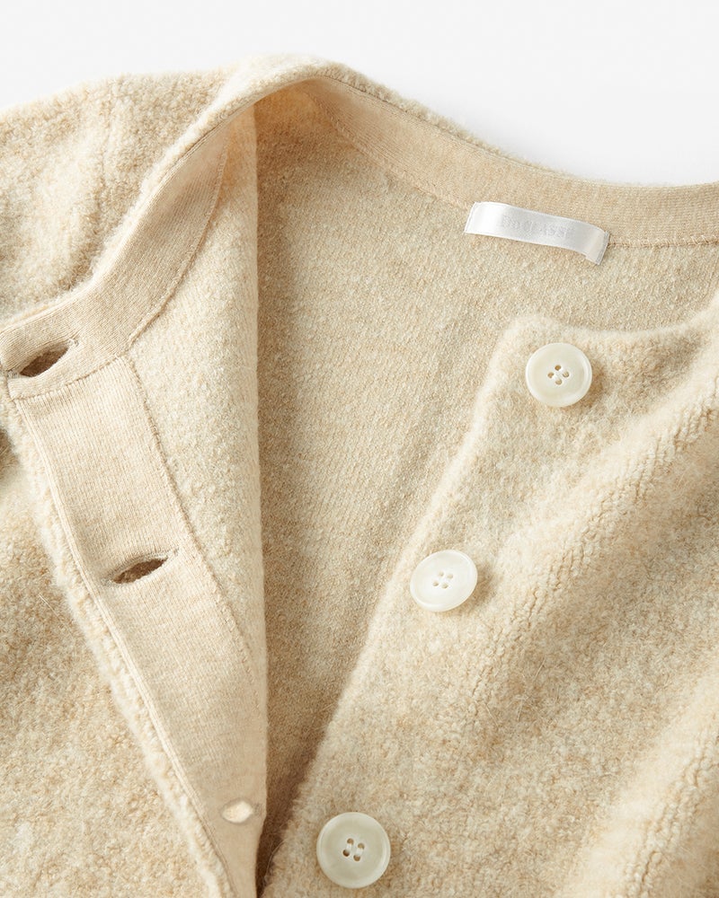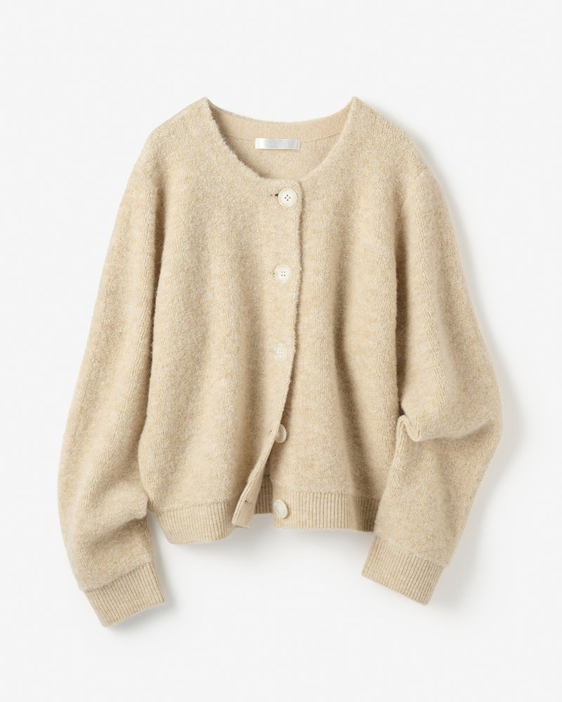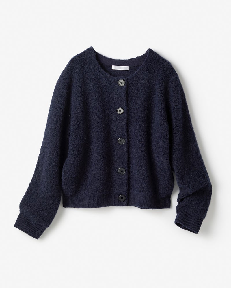 アルパカ混の暖かな風合いの糸をパイル地に編み立て表情豊かに仕立てたカーディガン。肌に触れる裏面はストレート糸で編み立てているので、肌触りもなめらかです。フロントは大きめのボタンで可愛らしく仕上げました。