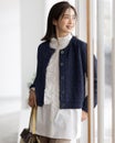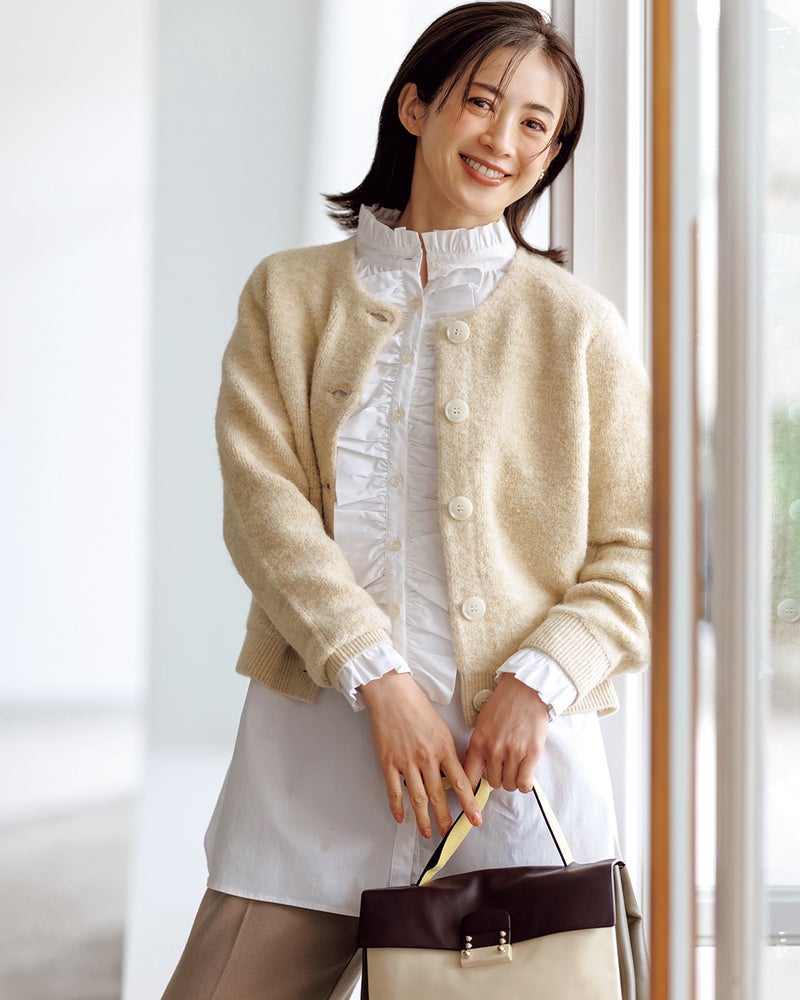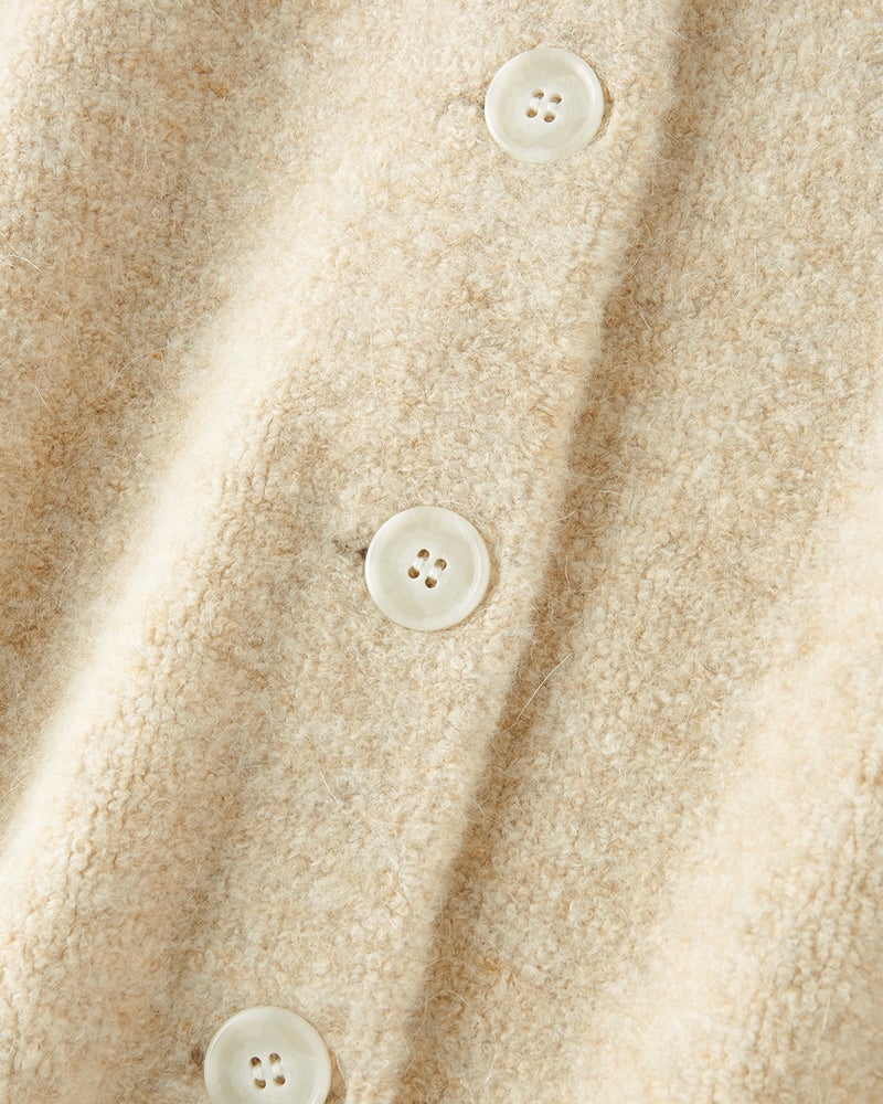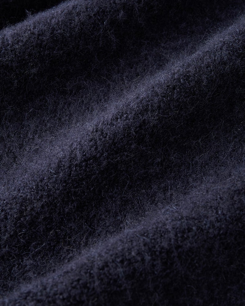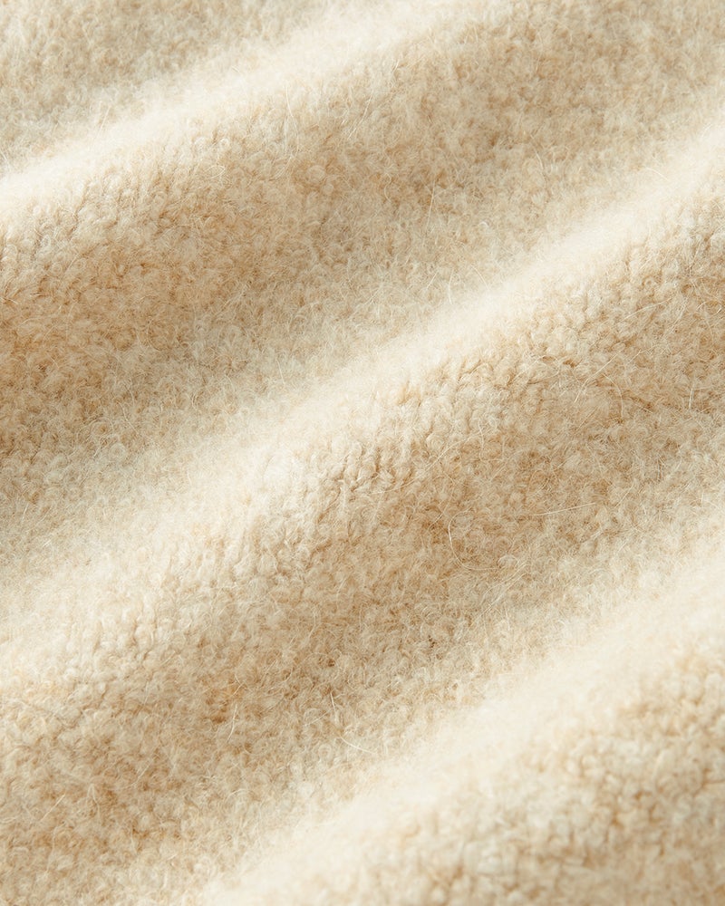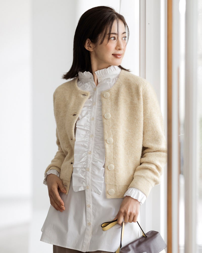 アルパカ混の暖かな風合いの糸をパイル地に編み立て表情豊かに仕立てたカーディガン。肌に触れる裏面はストレート糸で編み立てているので、肌触りもなめらかです。フロントは大きめのボタンで可愛らしく仕上げました。