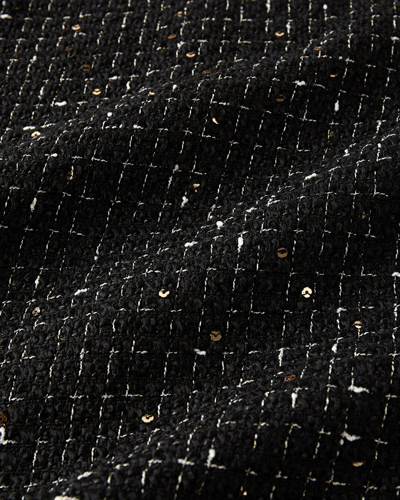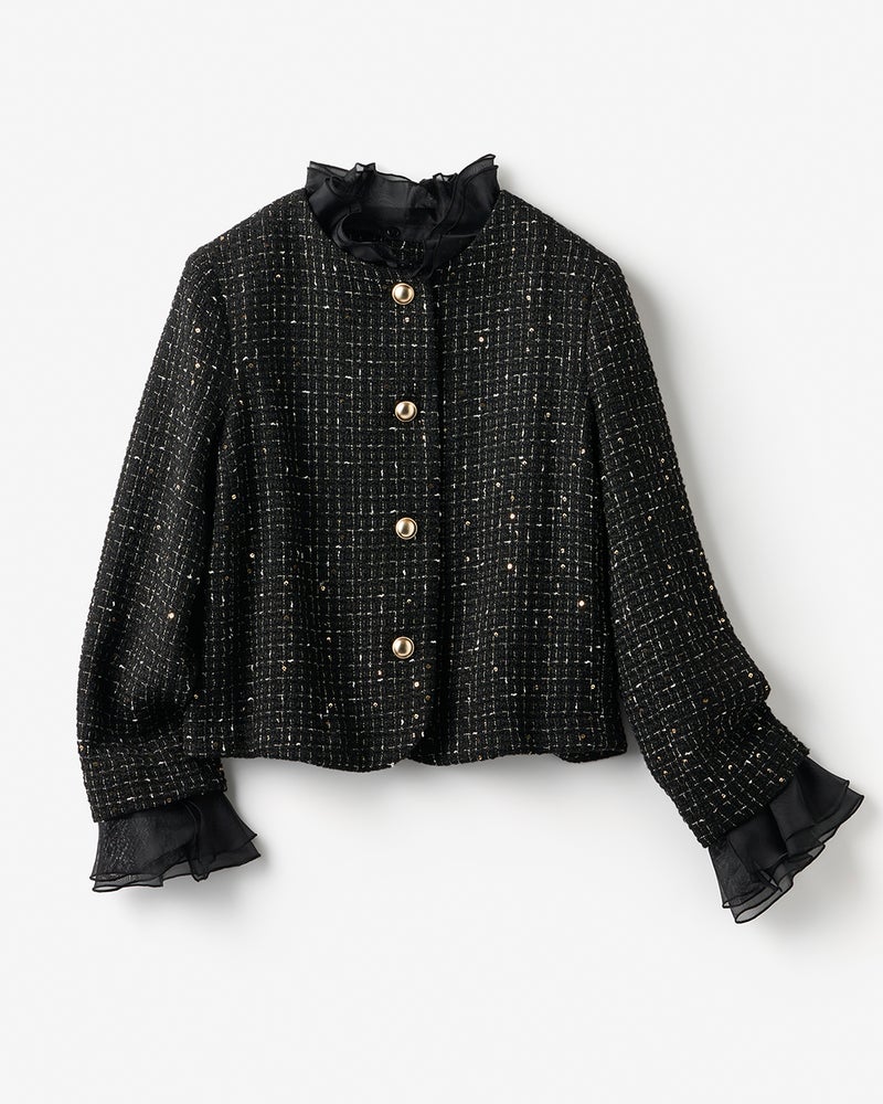 普段のサイズ:9 着用サイズ:9- 軽い着心地で立体感のあるツイード素材に華やかなスパンコールを散りばめた、Xmas~Newyearにぴったりなジャケットです。襟と袖口のオーガンジーのフリルは着脱できるので、外してカジュアルなデニムのパンツとのコーディネイトも相性バツグン。コンパクトな着用感なのでサイズで迷ったら上がおすすめです。32536のスカートとセットアップで着ると更に素敵です!