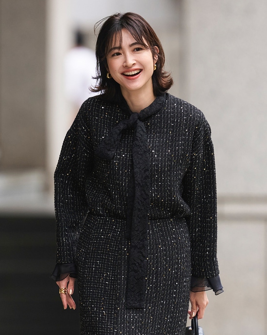 どんなトップスにも合わせやすい、ミディ丈のシンプルなスカート。ストレッチの効いたツイード調素材を使用。パーティやオケージョンにも似合う華やかさなのに、快適な着心地です。同素材のジャケット(32535)やプルオーバー(32534)とのセットアップもおすすめ。セレモニーシーンでも活躍します。