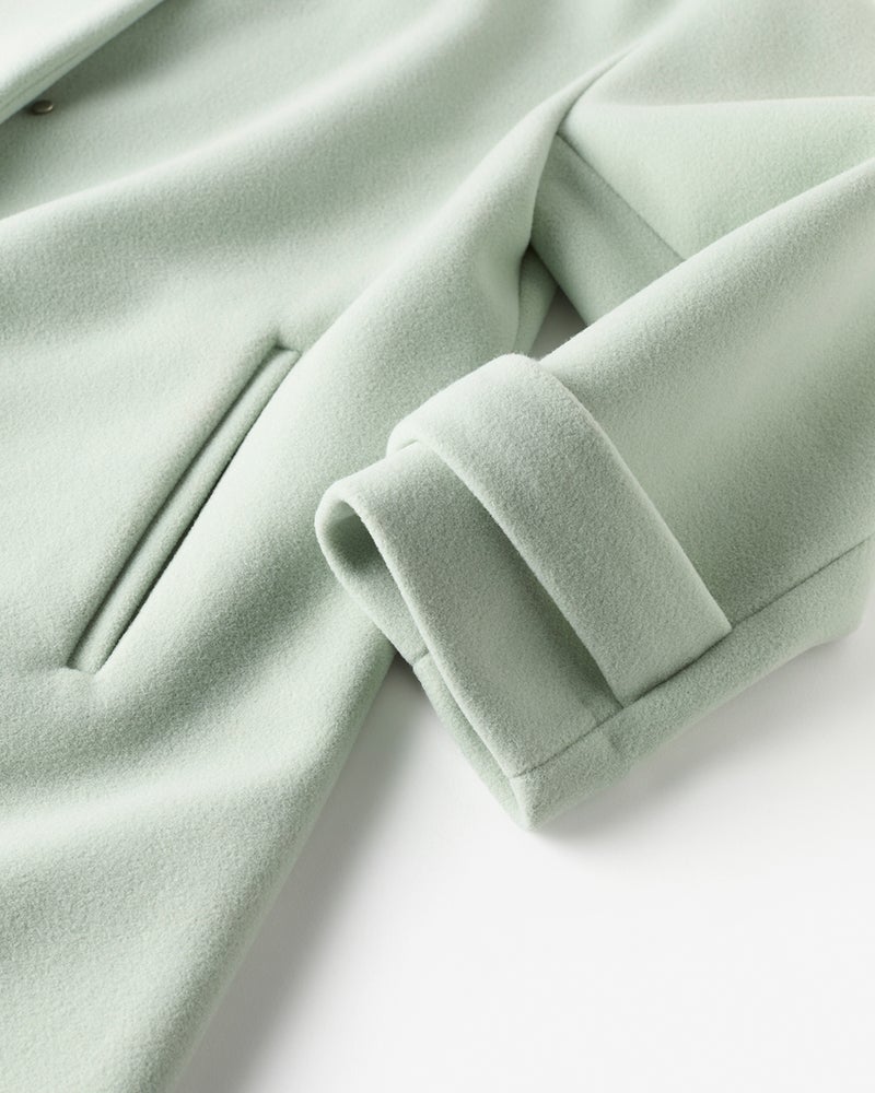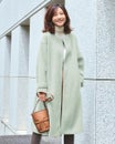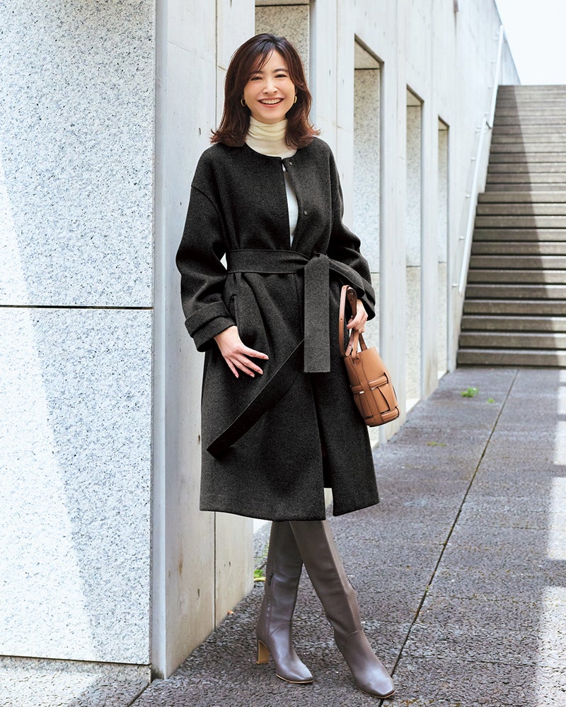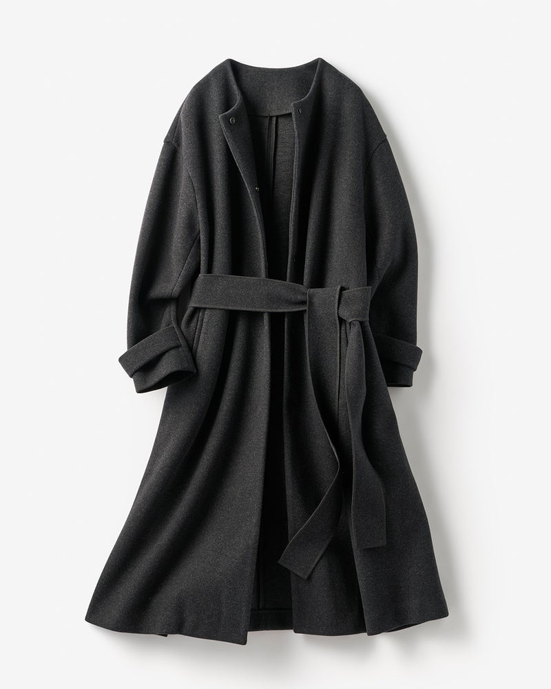 - ウールのような上質感と温かさがありながら、通常のウール素材より軽くて着心地のいいウールライクニードルを使用。分量感と抜け感のバランスにこだわった、今っぽいロングコートに仕上げました。共布ベルトをキュッと結べばドレスコート風にも。