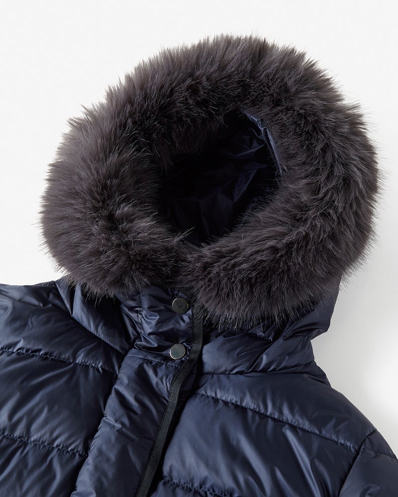 フードには、ふわふわ柔らかな風合いのエコファーをあしらうことで、顔まわりを華やげながらぬくもりをアップ。前立てとフード縁のグログランテープもさりげないポイント。シルエットを美しく保つのにも一役買ってくれています。