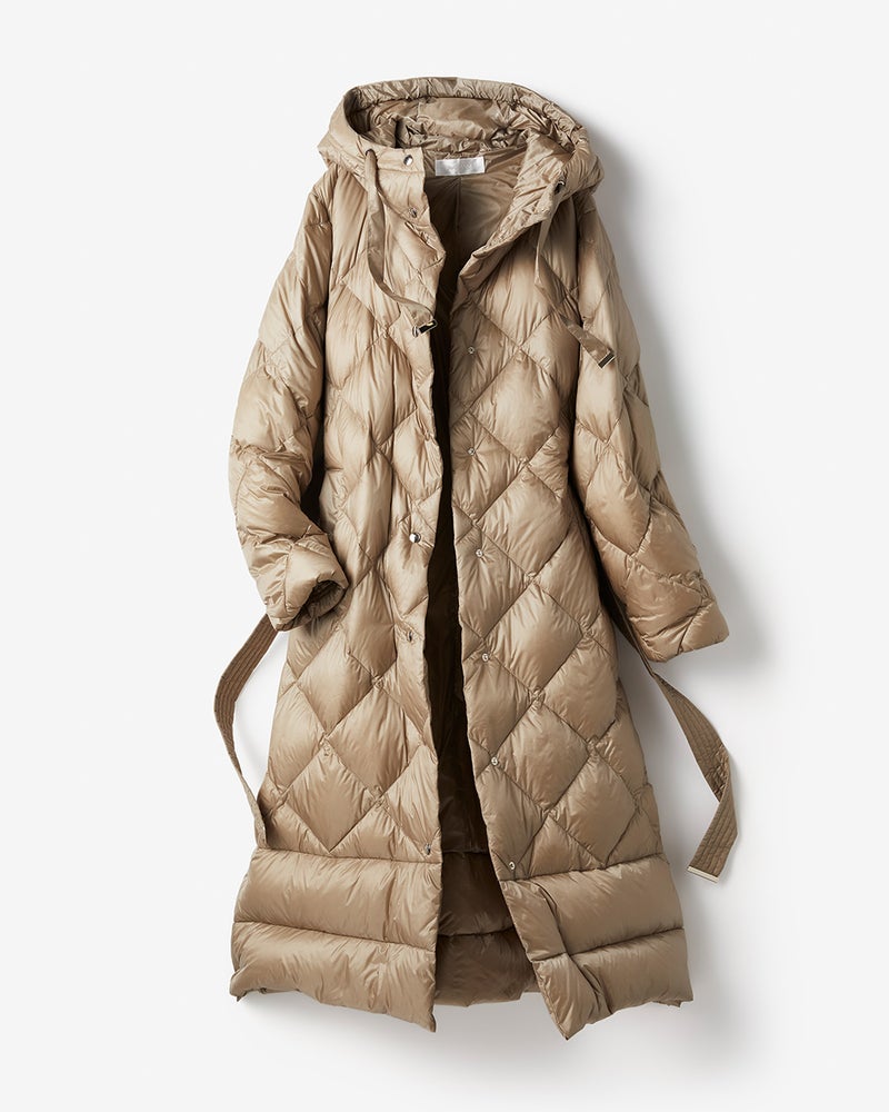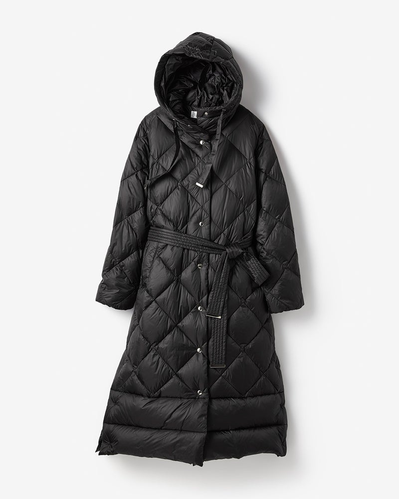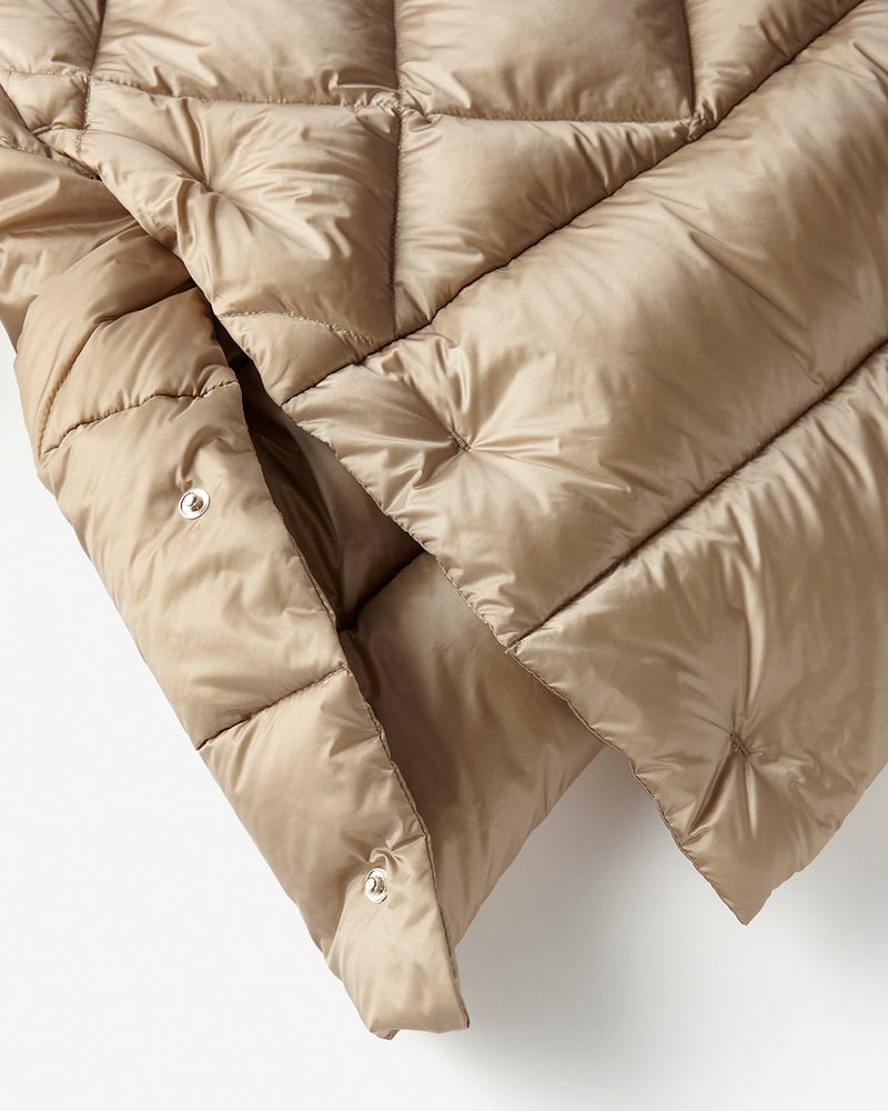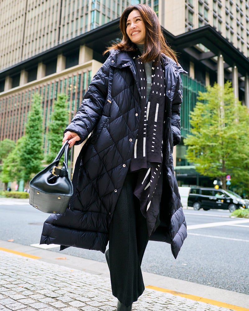 薄手タフタの光沢感とおしゃれなサイドスリットデザインで仕立てたドレッシーなロングダウンは、ワンピやスカートなどのフェミニンスタイルにもぴったり。ベースはダイヤ柄キルト、横キルトで切り替えてメリハリアップ。裾部分はサイドをボタン開閉できるスリットで軽やかな着こなしを叶えます。