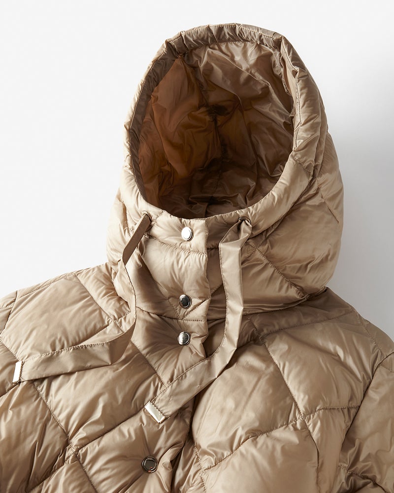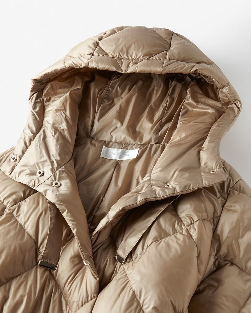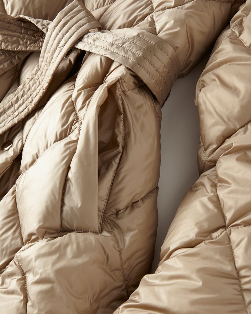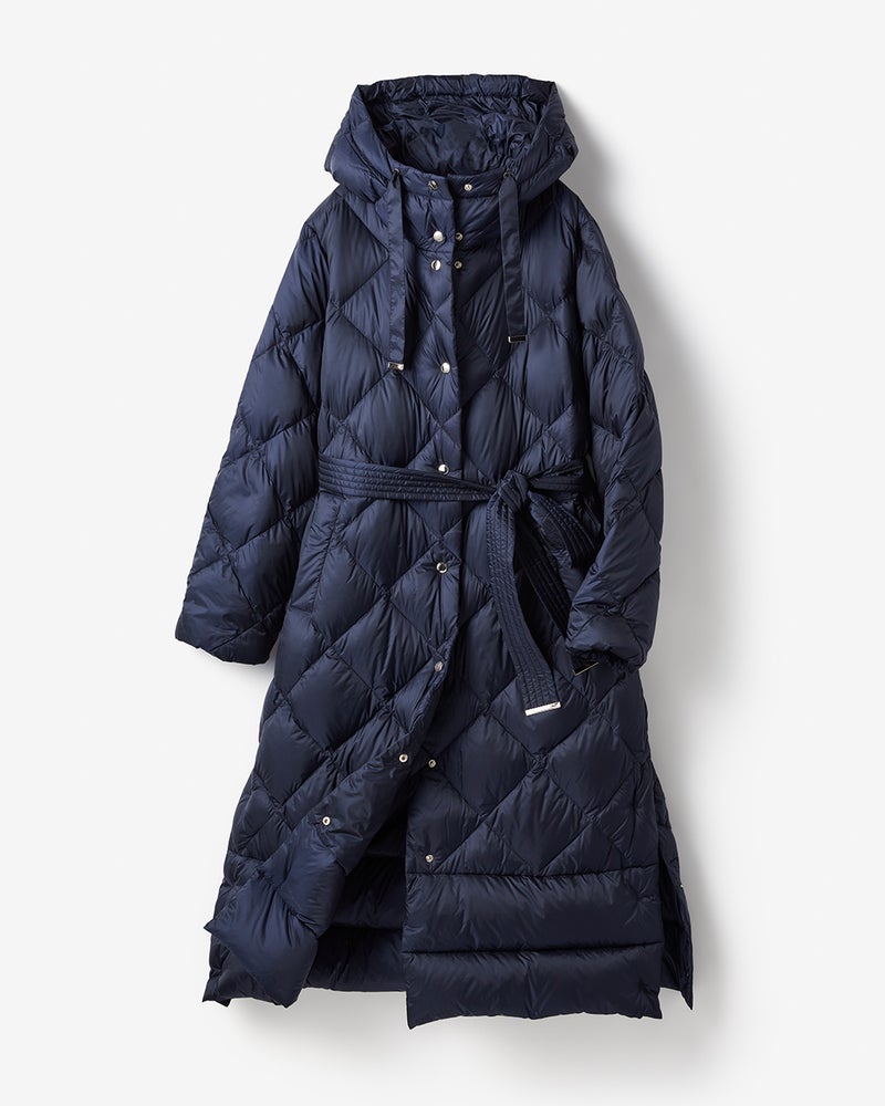 薄手タフタの光沢感とおしゃれなサイドスリットデザインで仕立てたドレッシーなロングダウンは、ワンピやスカートなどのフェミニンスタイルにもぴったり。ベースはダイヤ柄キルト、横キルトで切り替えてメリハリアップ。裾部分はサイドをボタン開閉できるスリットで軽やかな着こなしを叶えます。
