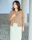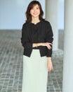 ウールを使わず、肌触りなめらかに編み立てたハイゲージのアンサンブルニットは、カーディガンのネックラインにあしらったカットビーズがチャームポイント。顔まわりに光を集めながら、肌を明るく見せてくれます。