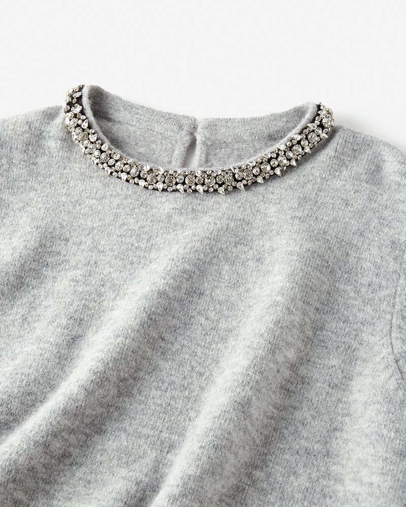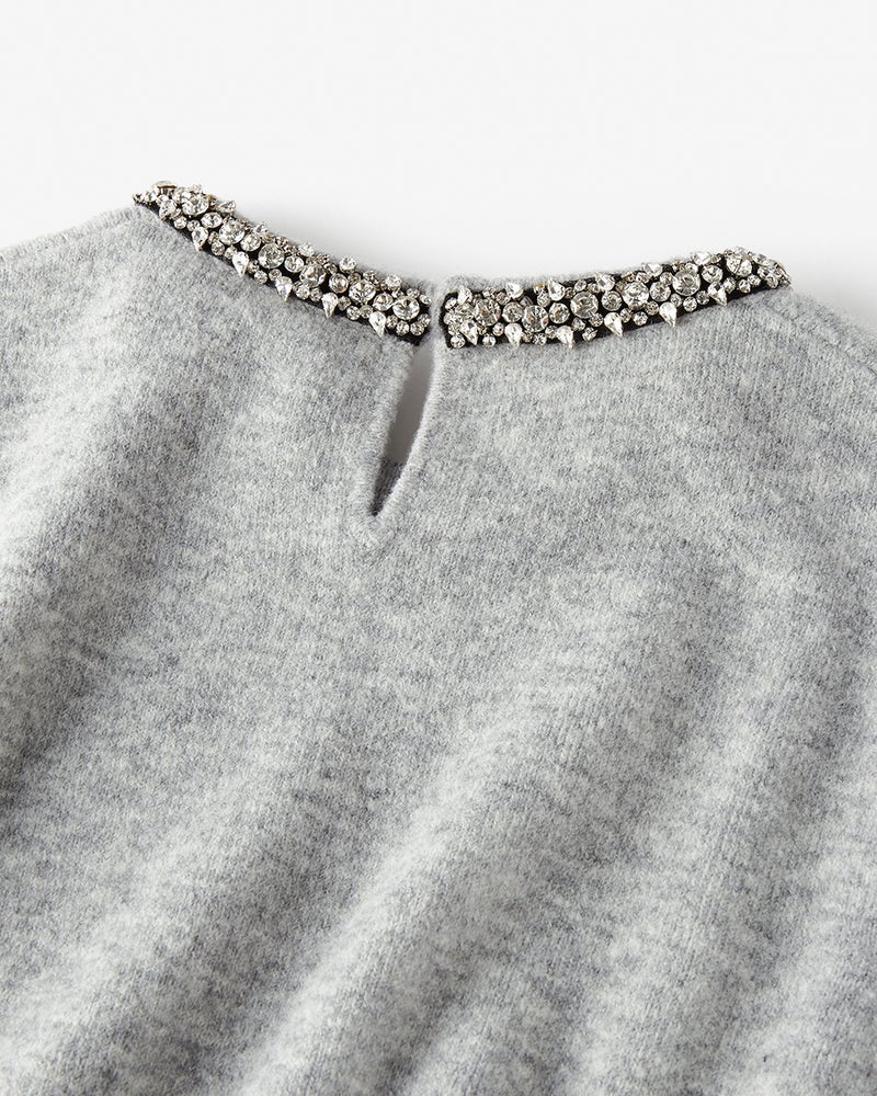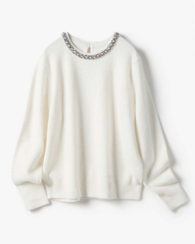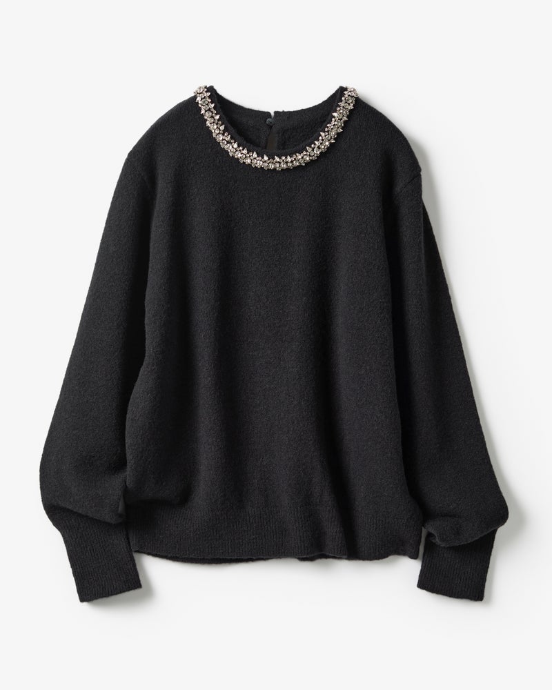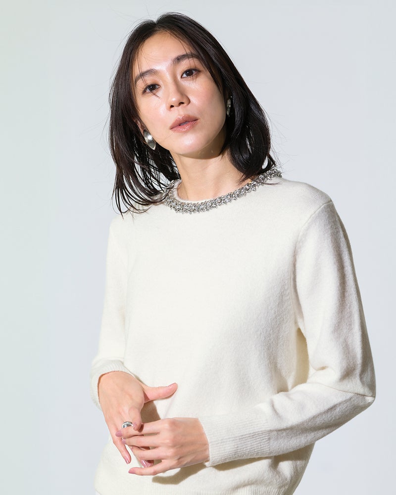 柔らかなニットの着心地で、ラグジュアリーなアクセサリー顔負けの華やかさが纏えるクリスタルのように輝くビジューネックセーター。ベースはふっくらなめらかなぬくもりのウール混ニット。スカートにもデニムにも合わせやすい、すっきりフォルムの1枚に仕上げました。