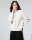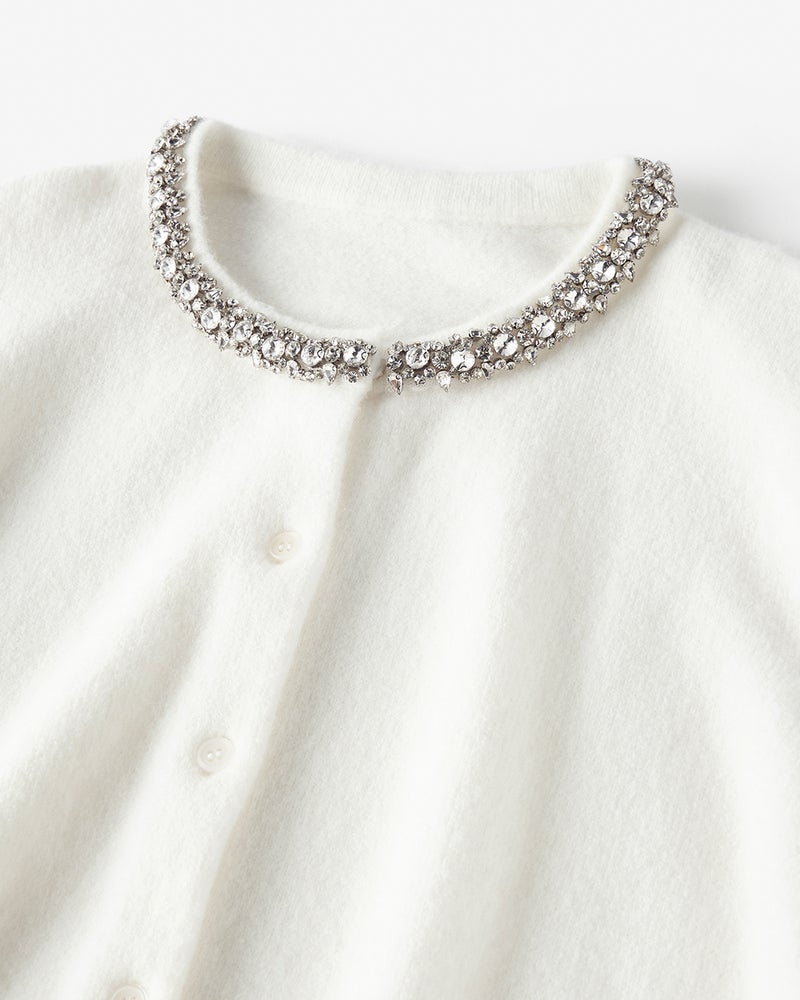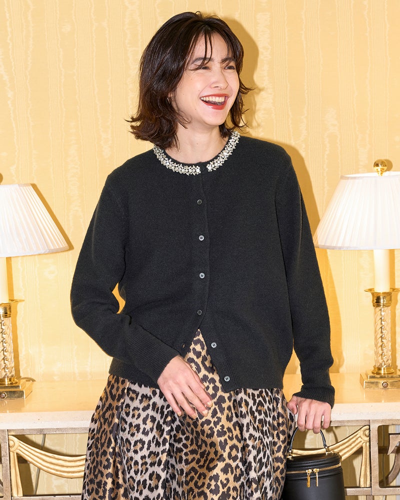 柔らかなニットの着心地で、ラグジュアリーなアクセサリー顔負けの華やかさが纏えるクリスタルのように輝くビジューネックカーディガン。ワンピの上にさっと羽織ったり、ボタンを閉じてプルオーバー風にも着られる着回し度の高い1着。コンパクトなシルエットは、華やかなボリュームスカートにもバランスよくスタイリングできます。