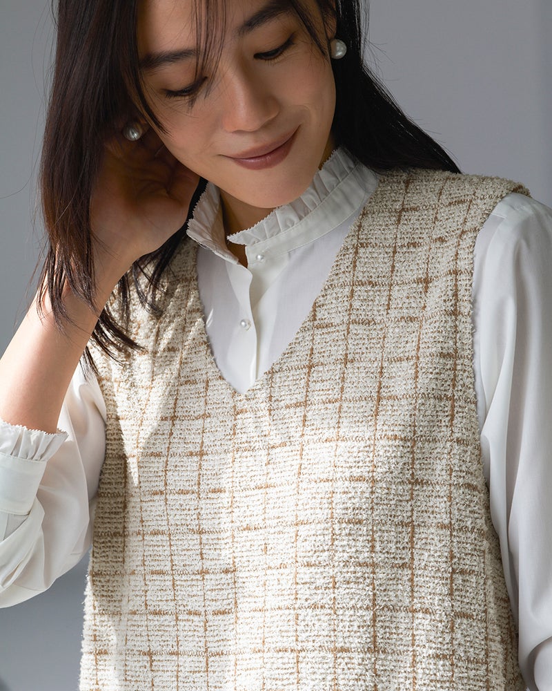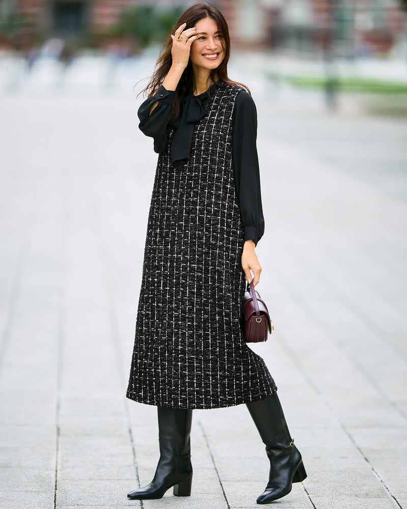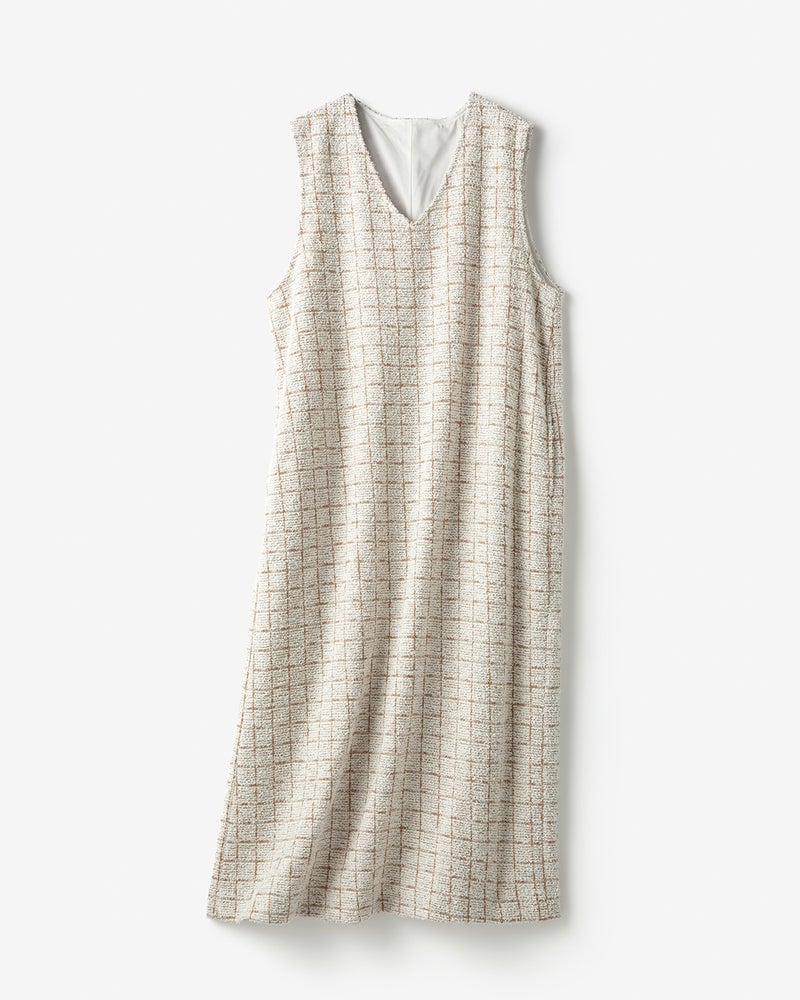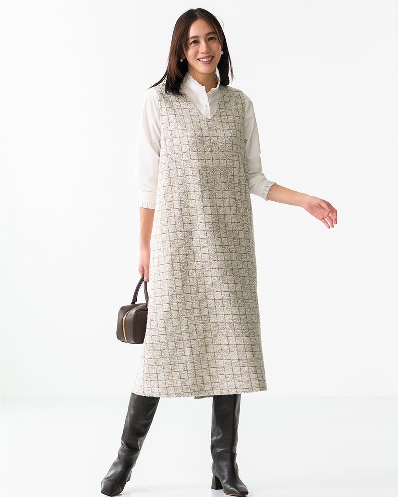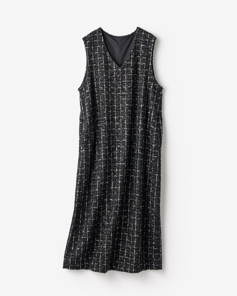 モノトーンチェックにラメ糸で煌めきをプラスしたツイード調ジャカード素材のジャンスカ。輪郭をすっきり見せる深Vネックで、ニットやブラウスなど様々なトップスとレイヤードしやすいデザインです。かぶりで着られる楽々設計。両サイドにはポケットを備えています。伸縮性のあるリラクシーな着心地も魅力。
