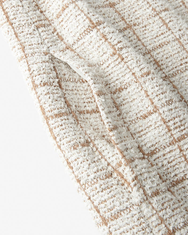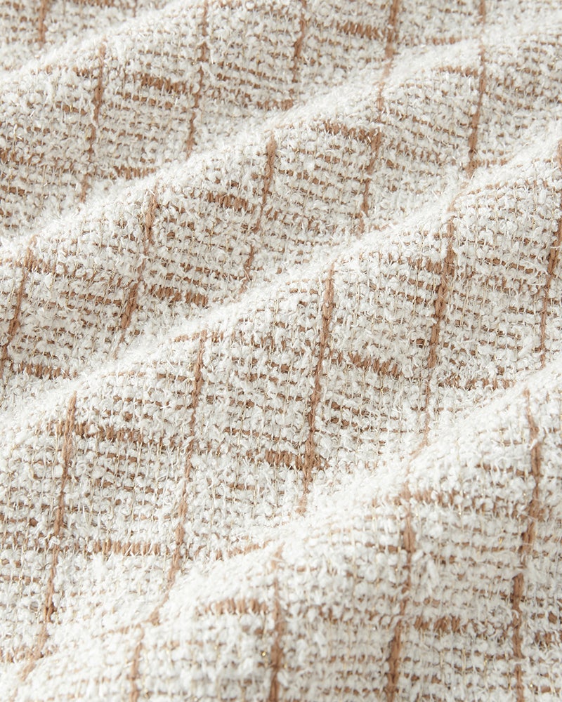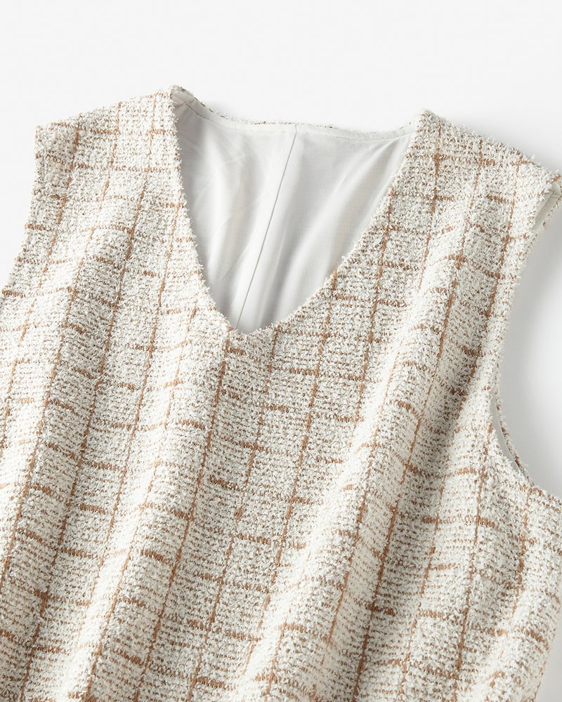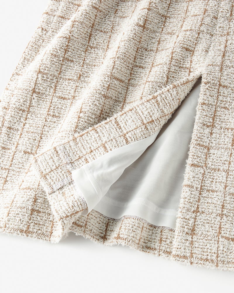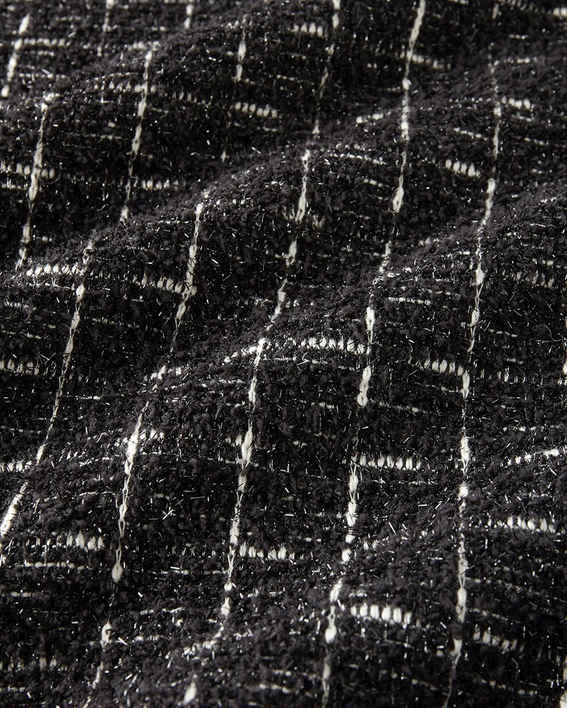 モノトーンチェックにラメ糸で煌めきをプラスしたツイード調ジャカード素材のジャンスカ。輪郭をすっきり見せる深Vネックで、ニットやブラウスなど様々なトップスとレイヤードしやすいデザインです。かぶりで着られる楽々設計。両サイドにはポケットを備えています。伸縮性のあるリラクシーな着心地も魅力。