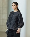 時代を超えて愛されるレオパード柄を、ネイビーベースのジャカード素材でモダンにアレンジ。ゆったりと仕立てたクルーネックブラウスは、1枚で華やかスタイルが完成するアイテム。前後に奥行きを持たせたAラインフォルムはどんな体型もふわっとカバー、ふっくらボリュームのある袖口パフのデザインも華やかさのポイント。