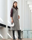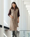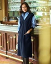 ぬくもりがあり、のびのび着られるニードルジャージーを素材に使用。インに着るのがボリュームのあるニットでもレイヤードしやすい、ゆったりリラックスフィットのシルエット。しかもシックで上品な表情にまとまります。前でも後ろでも結べる共布ベルト付き。